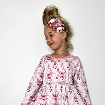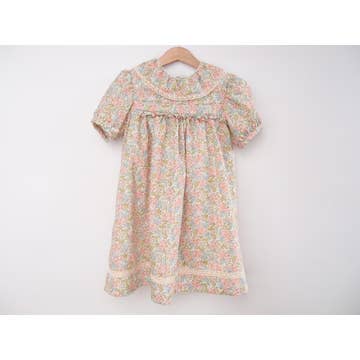 This charming dress features luxurious gathers starting from the smocked yoke for an elegant drape. There is an eye-catching trim around the neck and cuff ruffles that completes the look. This is our comfort wearing, head turning, look with a timeless vibe. It’s a start to a bright confident day that we are sure to be loved by your little ones. Available in our signature handblock prints: a stunning bright pink floral with a mustard base and the vintage pink timeless motif on a beige background. * Length 5-6Y: 26 in; Chest relaxed 5-6Y: 27 in * 100% cotton. Lined with 100% cotton voile. * Machine wash with like colors. Tumble dry. * Our model is 5 years and wearing 5-6Y