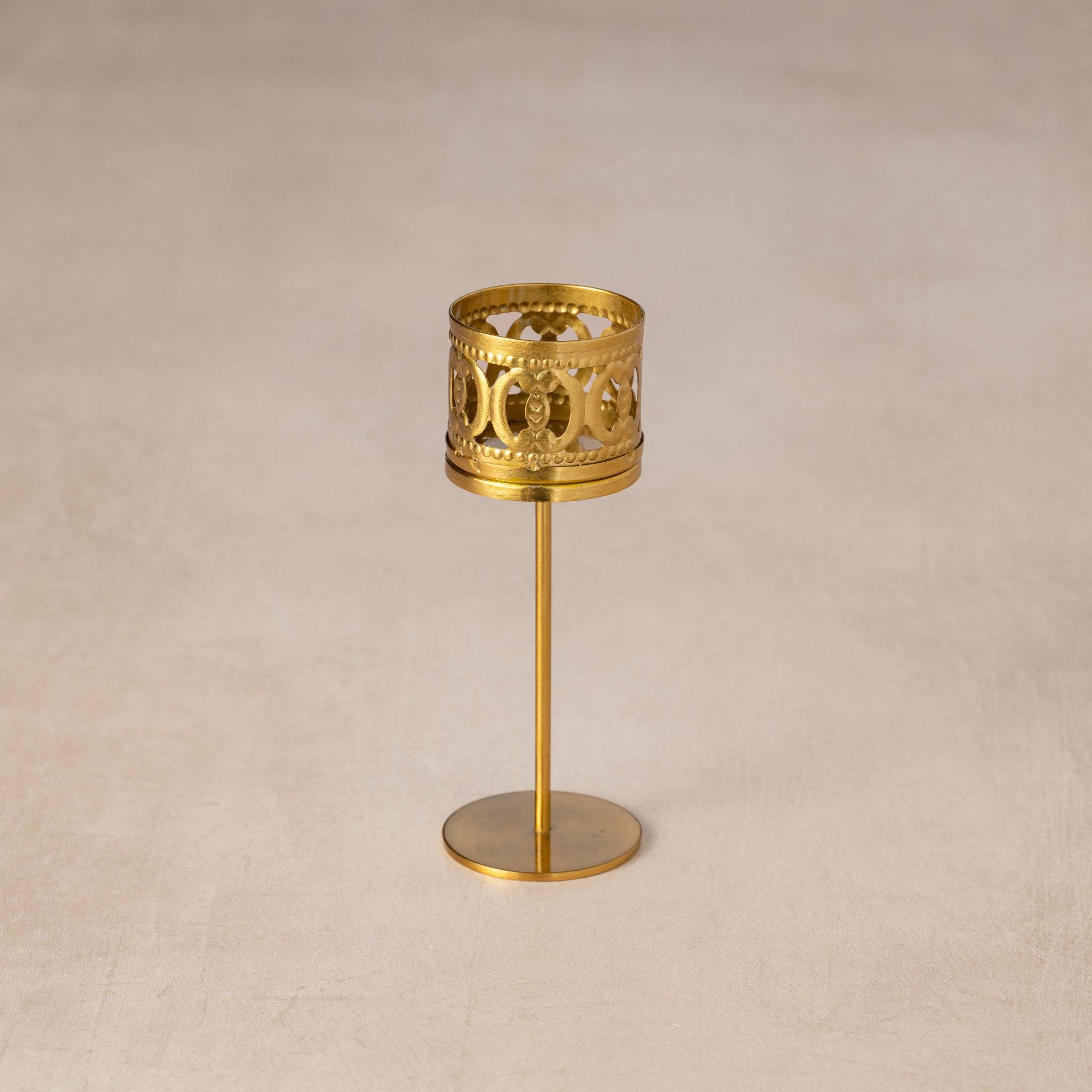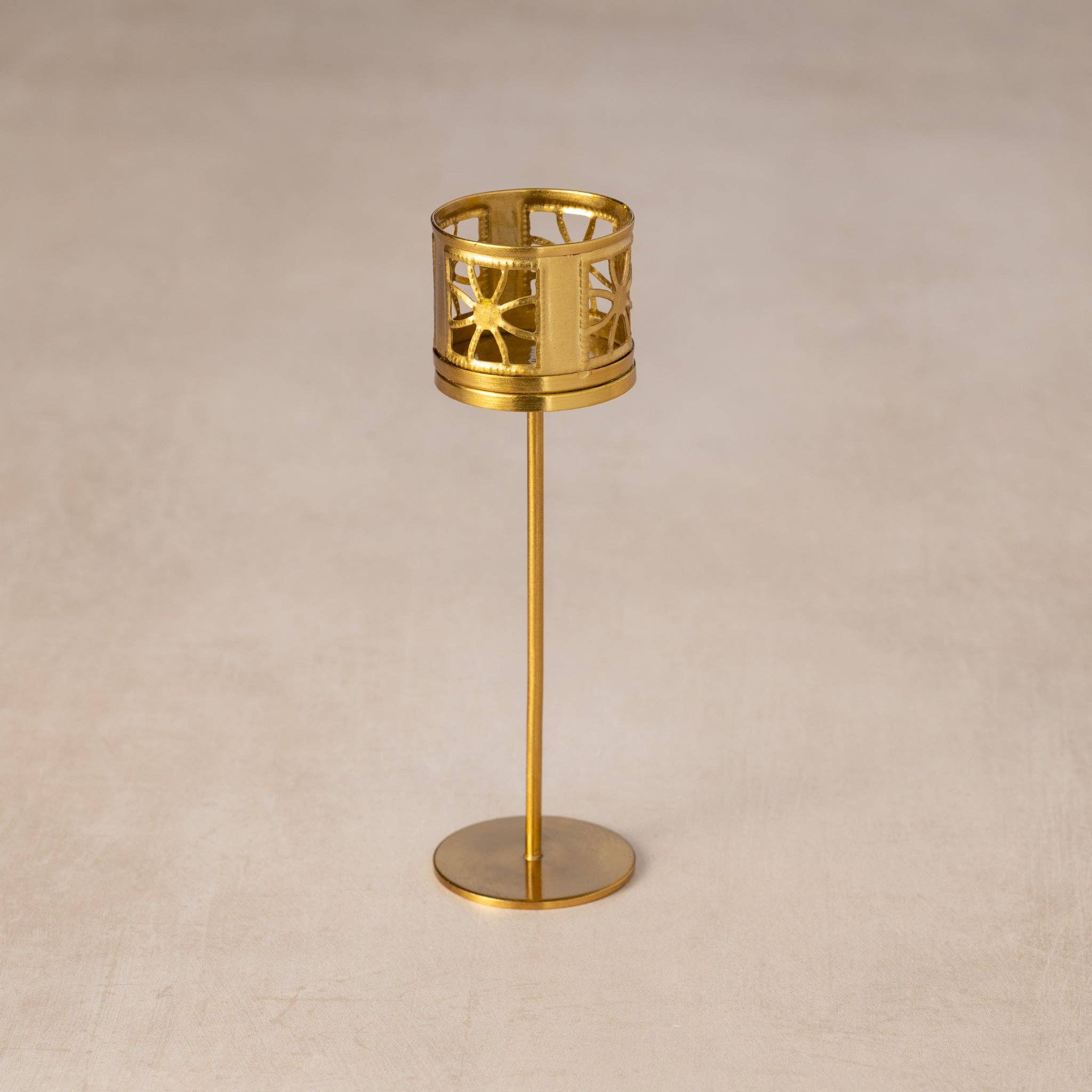 Add a warm, ambient glow to any room with this versatile candleholder! The tealight holder is a cylinder that features a gorgeous lattice cutout design. For a taller presentation, twist the threaded rod of the base into the bottom of the cylinder. Simply remove the rod for a low profile. Two beautiful looks in one! Made of durable iron with a brushed brass plated finish. A Ten Thousand Villages Exclusive meticulously handcrafted in India. Materials: Iron with Brushed Brass Plated Finish - Measures: 6"H - Colors: Brass - Notes: Use a tea light candle only. Candle not included. Do not leave candles burning unattended. - Pictured with our Entwined and Sunrise Candleholders (sold separately) - Handcrafted in India