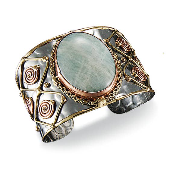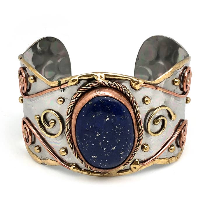 A beautifully handcrafted cuff that highlights the perfect balance of tradition and timeless design. Made by skilled artisans in India, each piece is shaped and finished by hand, showcasing the natural beauty of its carefully placed stones. Thoughtfully positioned throughout the design, the stones add a subtle sparkle and unique character to each cuff, making every piece truly one of a kind. Key Details: Handmade by artisans in India — each cuff is one of a kind Features beautifully placed stones for added elegance and charm Lightweight and comfortable open cuff design for easy fit A versatile statement piece that complements both casual and elegant styles