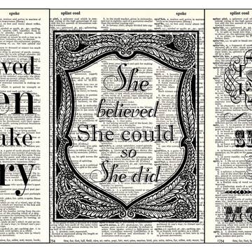 This is a sample of 3 Strength-themed Dictionary Art Prints. Dictionary Art Print measures approx 8" x 10.5". Frame not included, printed on authentic vintage dictionary page, perfect for an 8 x 10 frame or a standard 11 x 14 mat with an opening for an 8 x 10 print, frame is not included. Each page has a natural patina that will be different from book to book. Each print is packaged in a clear cello bag with a chipboard back and a seal of authenticity.