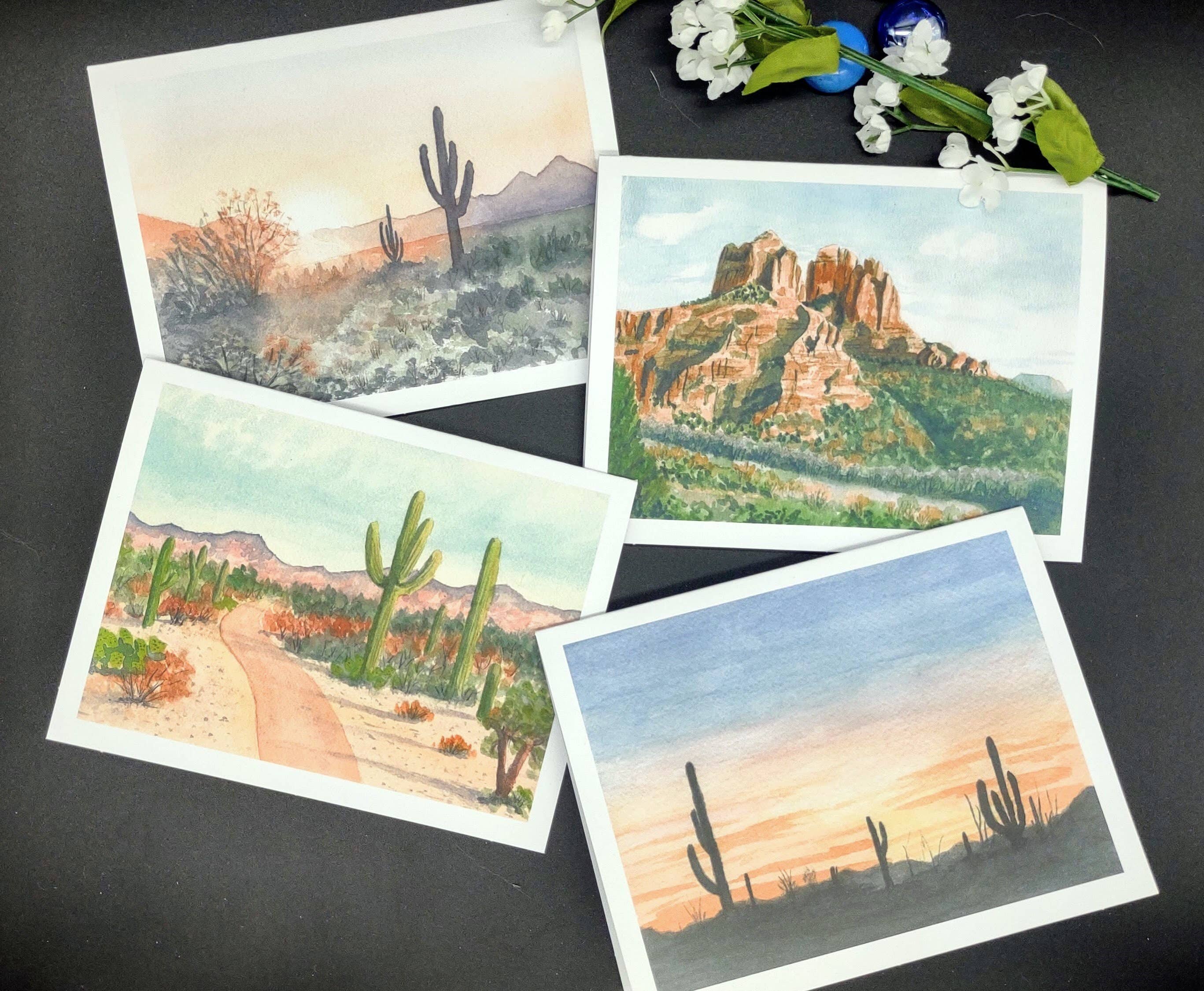 These Arizona greeting cards are printed from my original watercolor painting of this beautiful state. These cards will be packaged in a set of 6, envelopes included. Cards measure 4.25 x 5.5 inches. Cards are printed on high quality, heavyweight? 110 lb white card stock with a UV coating for a nice luster look. 6 cards/envelopes to a pack, tied with blue & white twine and placed cello bag.
