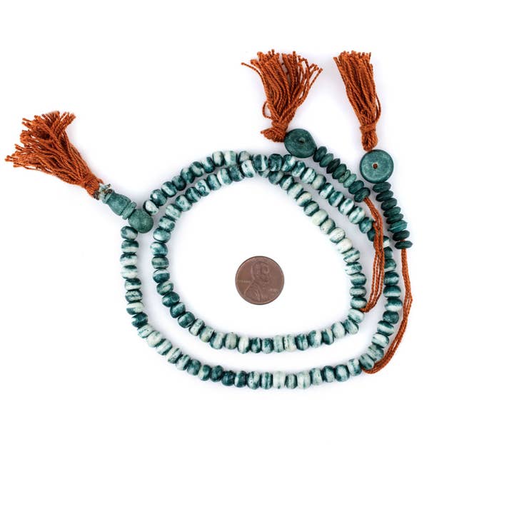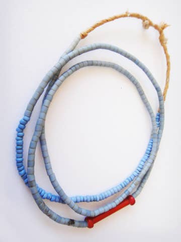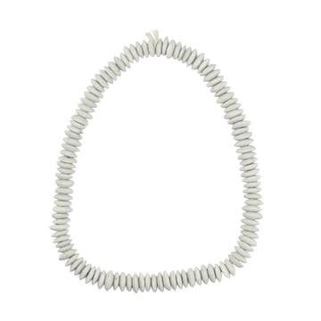 Checkout this beautiful strand of white color Ashanti glass saucer beads. The process of making these beads is unique to Africa and has been used for over 1000 years. Pulverized glass of various colors is poured into a clay mold, using a cassava stem for the bead's hole. The mold is placed in a furnace and heated until the glass particles congeal without actually melting and the stem burns out. The Ghanaians have been making beads in this manner since the 1600s.