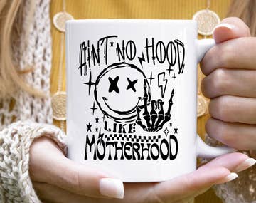 Ain't no hood like motherhood. Microwave and dishwasher safe, locally printed mugs. Design will not fade or wash off, printed with a commercial system. 15oz white only. Printed both front & back
