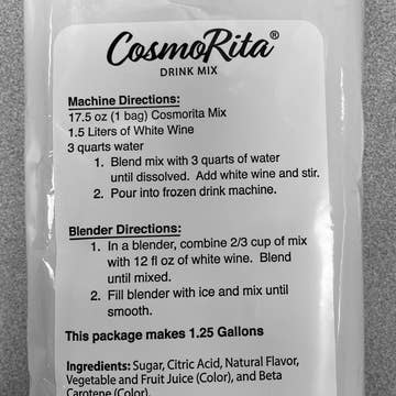 Combination of the cosmopolitan & frozen cocktail. Blend with white wine or vodka. Substitute ginger ale for wine. Can be made in blender or freezer. Bulk - 17.5 oz. - no minimum. Intended to be used in margarita machine Not encouraged for resale. Yields 1.25 gallons. Kosher.