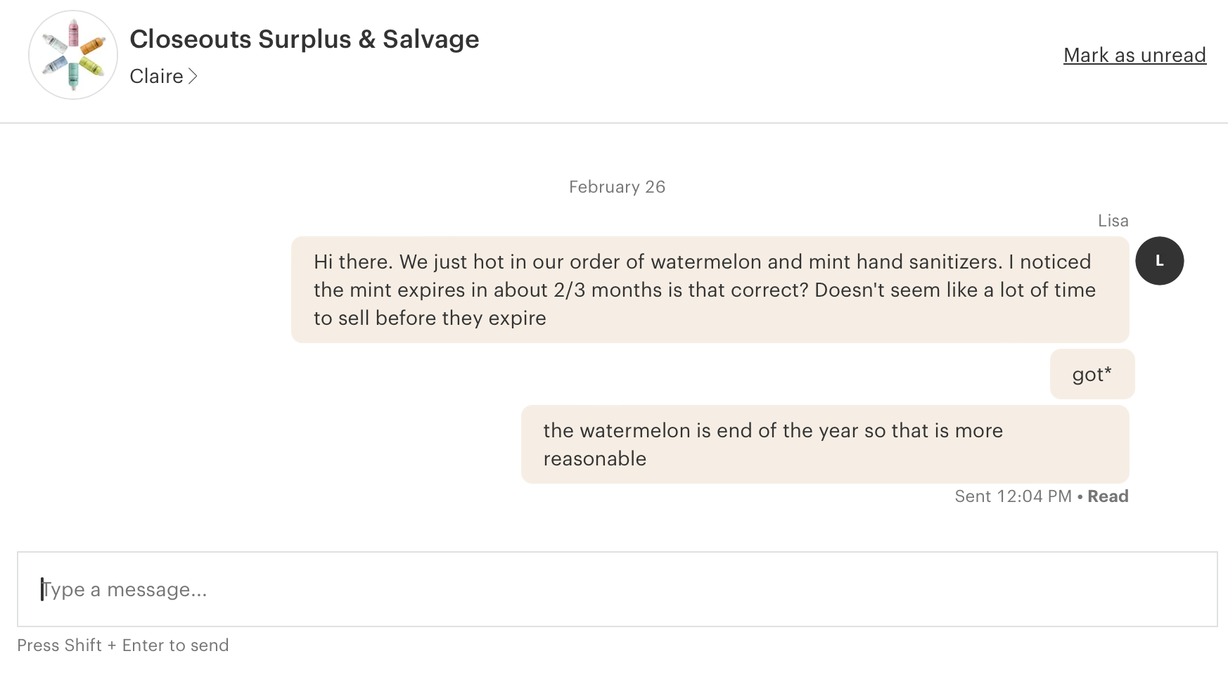 Very sad to be leaving this review, we've been working with Emu since we meet them at the Philly Gift Show in 2021. We just got in a "bad batch" of the mint hand sanitizer that expires in May. It's March. My customers do not want to buy a product that is expiring in two months. I immediately sent a message to customer service on here and they've replied to me before, but this message they have read (as you can see the read receipt at the bottom) and have neglected to reply. So disappointed!! ):