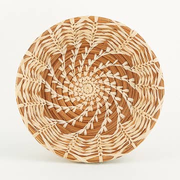 Handy Catarina Basket will add beauty to your organizational efforts. Set it by the door to catch your keys, on your desk to contain clutter or bedside for jewelry. Perfect for display too. Mayan Hands artisan partners in Sololá, Guatemala designed and handcrafted the center spiral design radiating to gently sloping sides. Approximately 6.5"W x 1.3"H