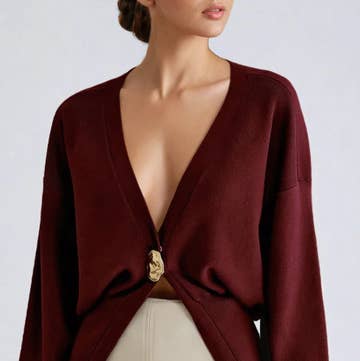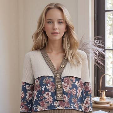 Made in Canada Aesthetic: Retro / vintage and Romantic / whimsical Fabric: 68 % Bamboo, 27 % Cotton, 5 % Spandex Terry Fit: Contemporary Neckline: V-neck Occasion: Everyday and Work Season: Fall/Winter Sleeve Length: 3/4 Sleeve Product Language: English Product Materials: Vegan Packaging: Recyclable, Recycled, and Reduced Production: Ethically sourced