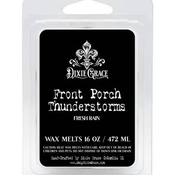 Front Porch Thunderstorms Ever watched a storm cloud roll across the sky? In the south, we do it from our front porch in a rocking chair with a glass of sweet tea. Hear the thunder and feel the ground shake with this deep, fresh rain scent. Watch out for the lightning! Scent Strength - 2.5/5 - Fresh, Clean Wax Melts For use in Wax Warmers, these cubes of scented wax are sure to take you down south in no time! Wax Warmers are available for purchase from Dixie Grace Candle Company or use your own for a flameless alternative to candles! Burn Time (approximate) - 60 to 70 Hours of Warming Time We recommend warming 2 cubes for 3-4 hours at a time over multiple uses until scent is gone from the soy wax. Prolonged warming (more than 3-4 hours) will deteriorate the scent faster but is safe if prolonged warming is preferred. When you're ready to change scents, carefully soak the melted wax up with a cotton ball (or two or three) and toss in the trash. Be sure to wipe residual wax from the warmer before adding new scent cubes. Do not put down sink drains for any reason.