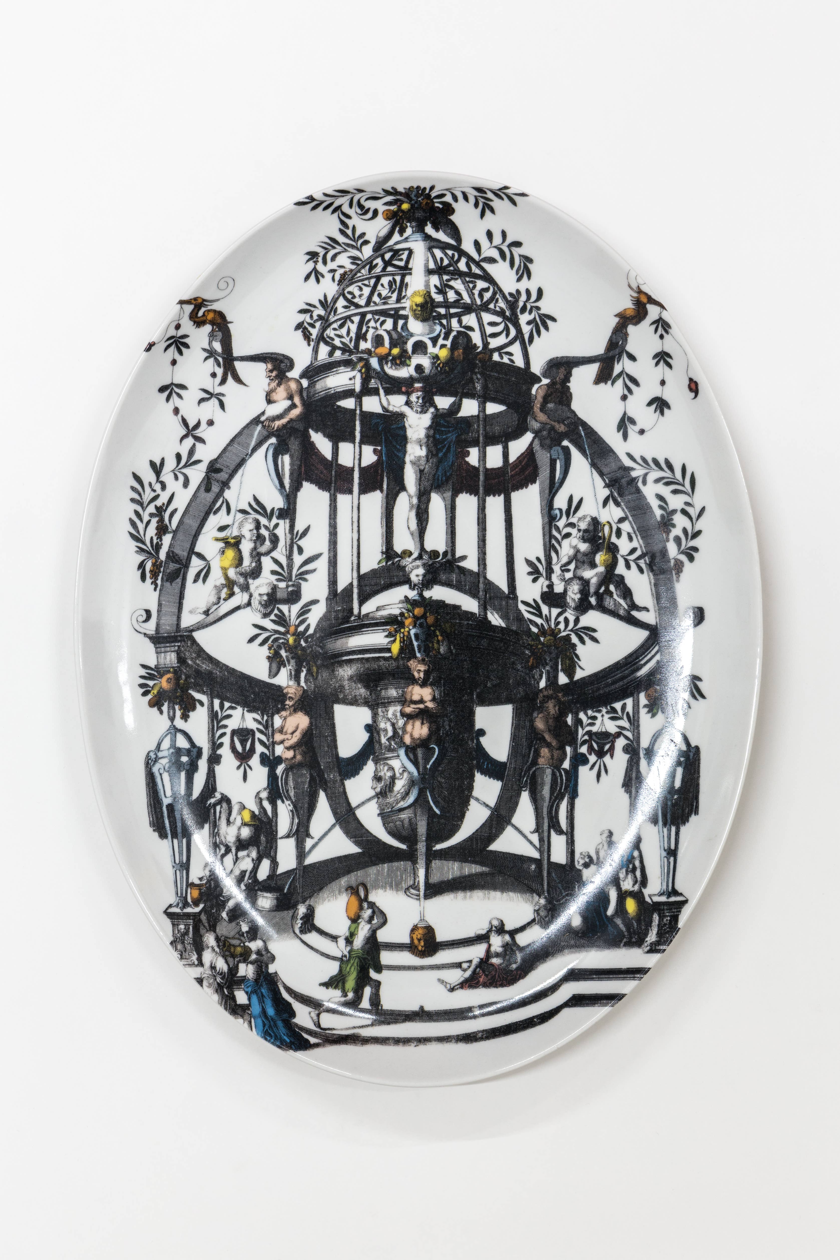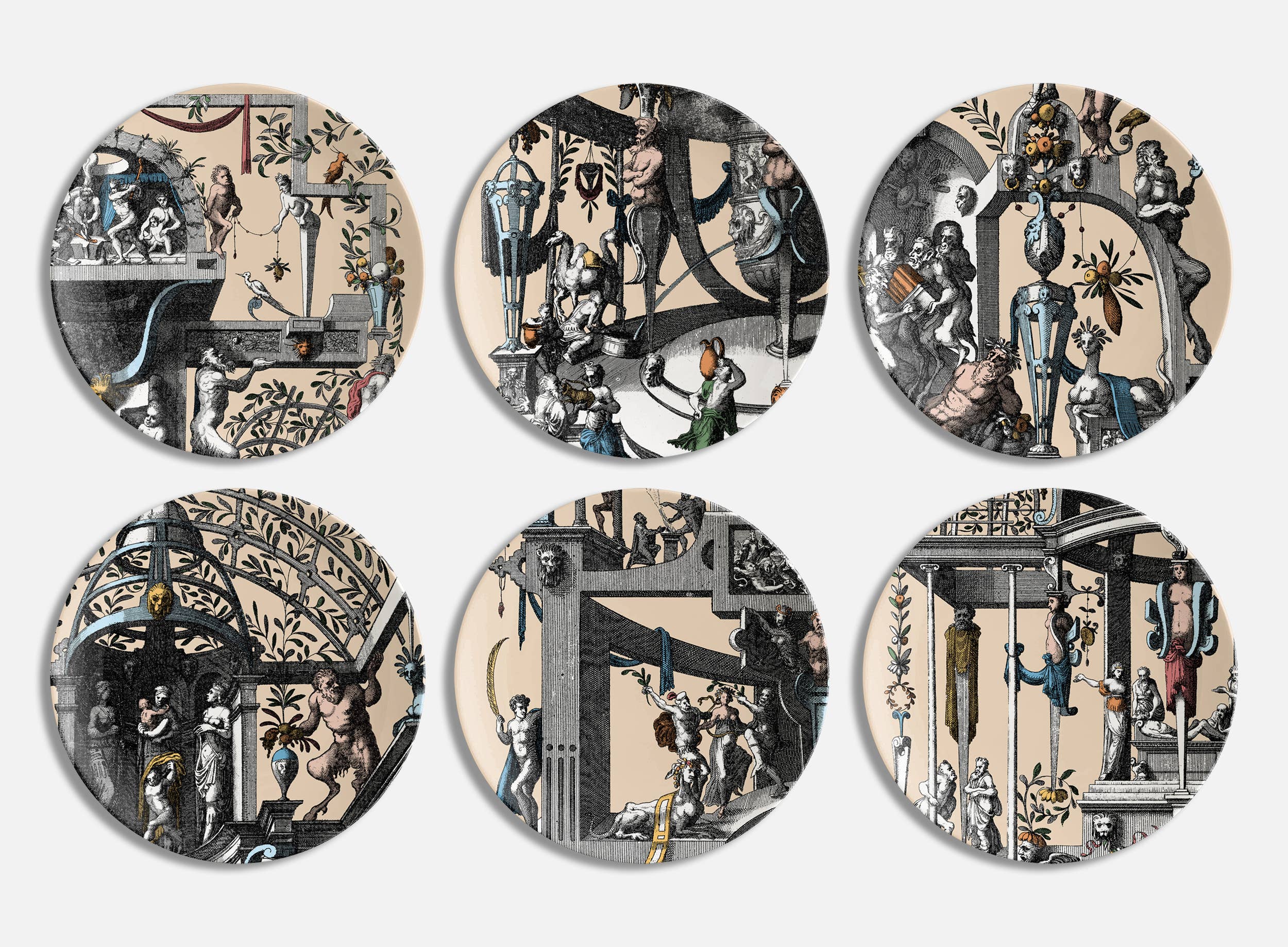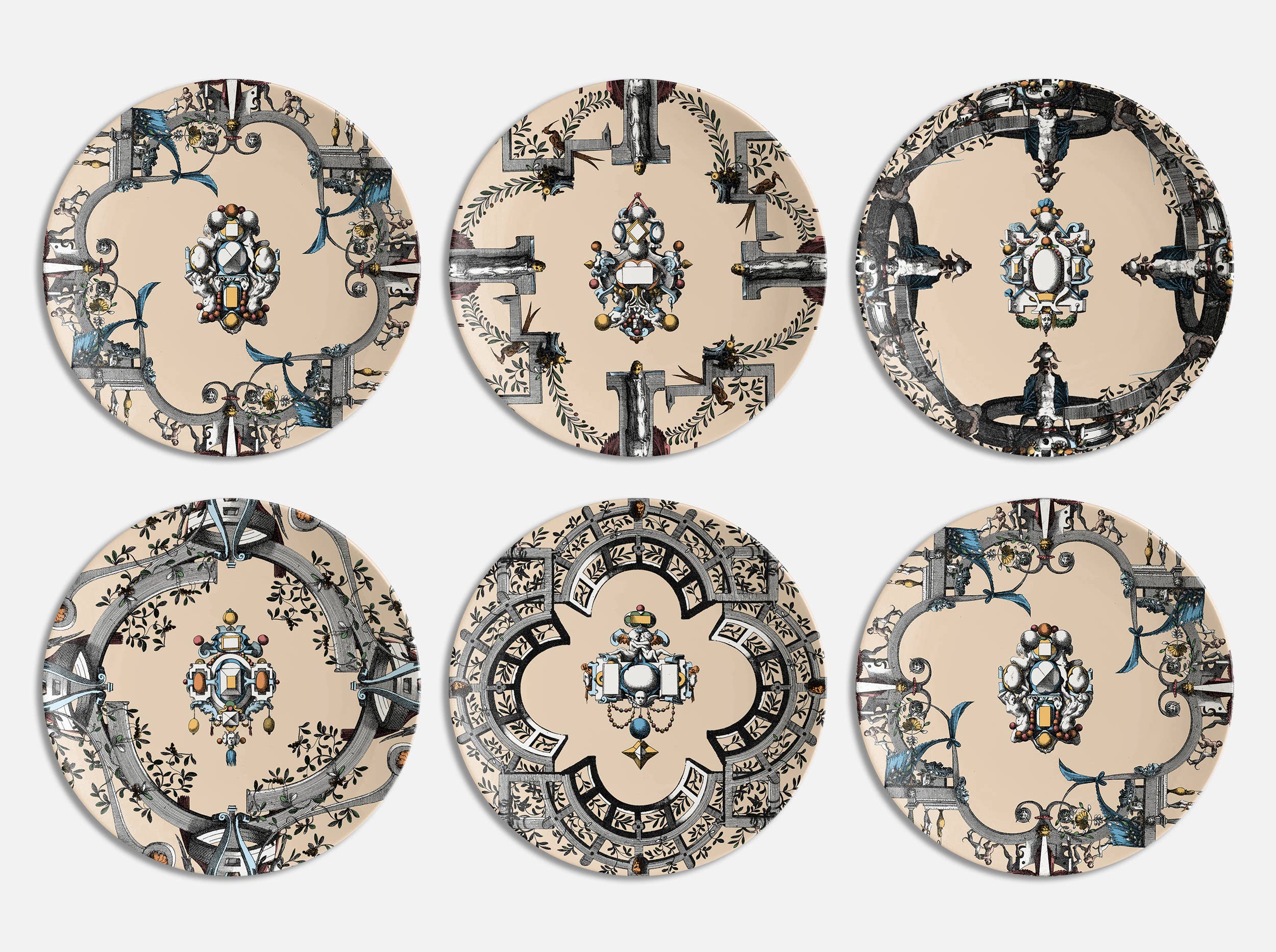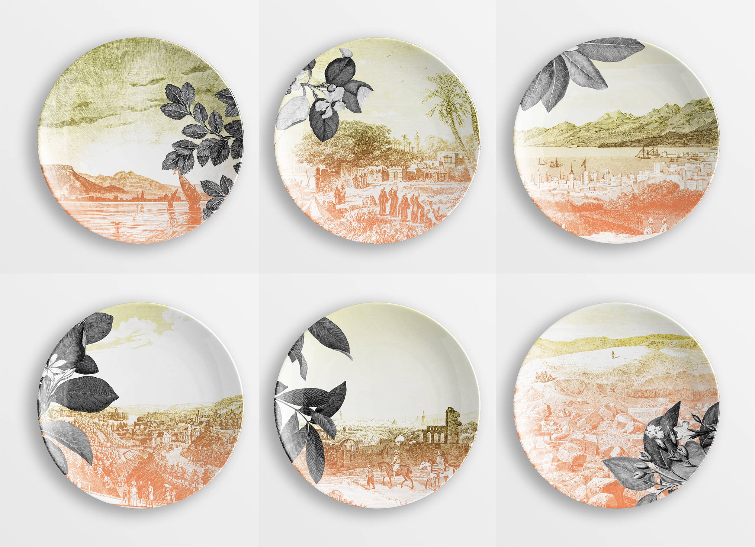 Mediterraneo is the porcelain collection signed by Grand Tour by Vito Nesta that wants to embody the spirit of the magical area of the homonymous sea. The elements that characterize these decorations are three: illustrations of magnificent triumphal arches in a turquoise tone, views of characteristic Mediterranean places treated with a color that recalls the sunset and a plant element that frames each scene. The result is small dreamy paintings, a dive into a warm and joyful atmosphere where anything can happen. Set of 6 tea cups with saucers (diameter 8.5 cm height 5.7 cm, saucer diameter 15 cm).