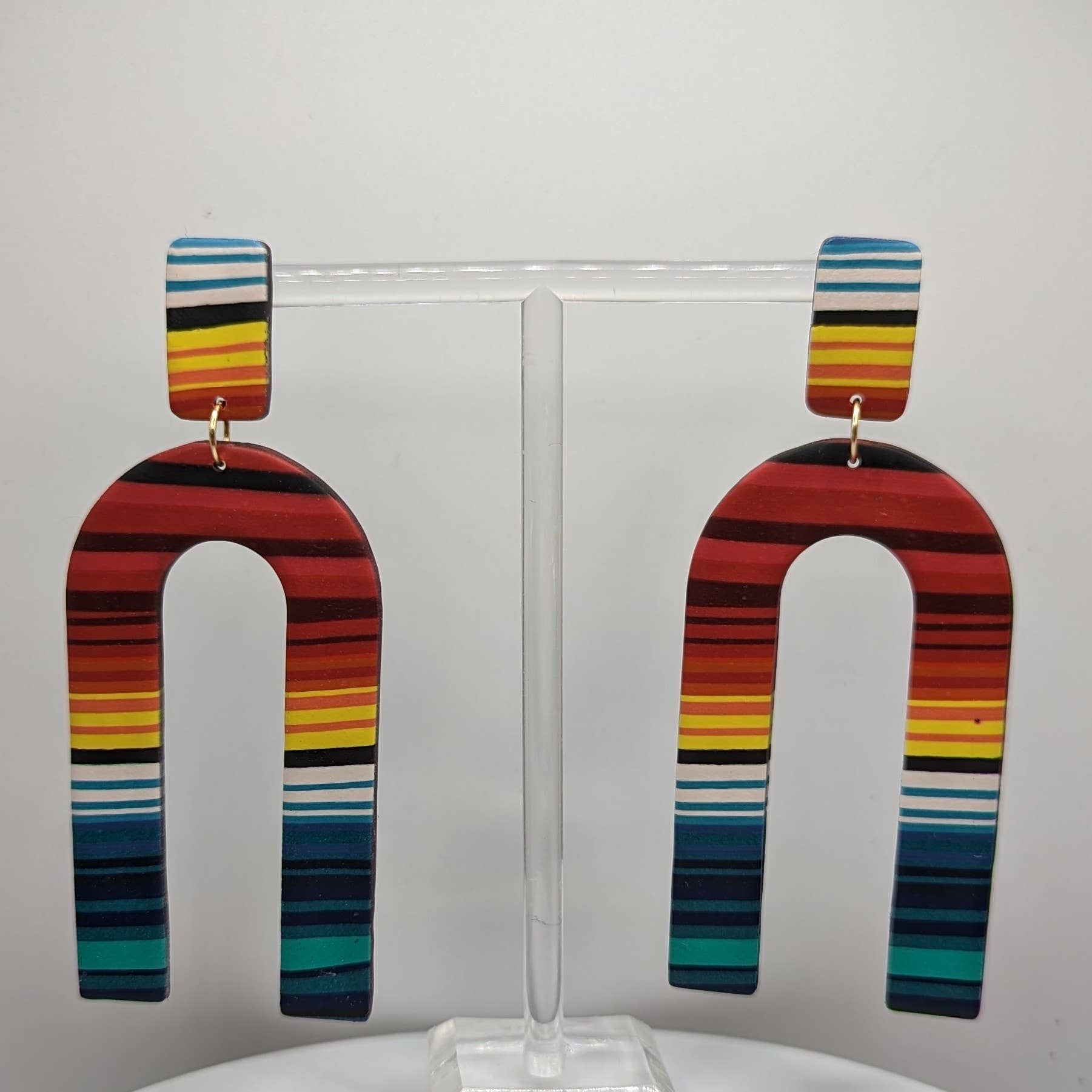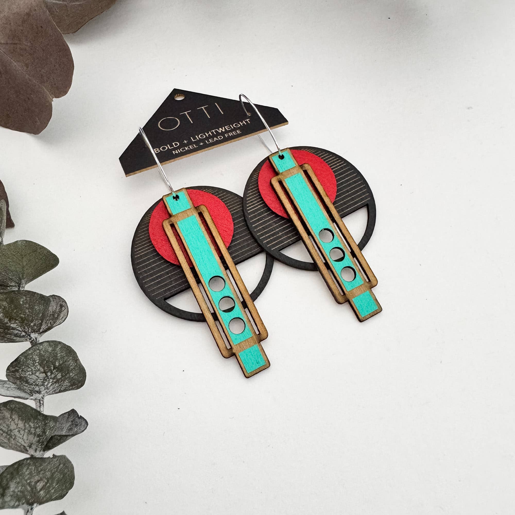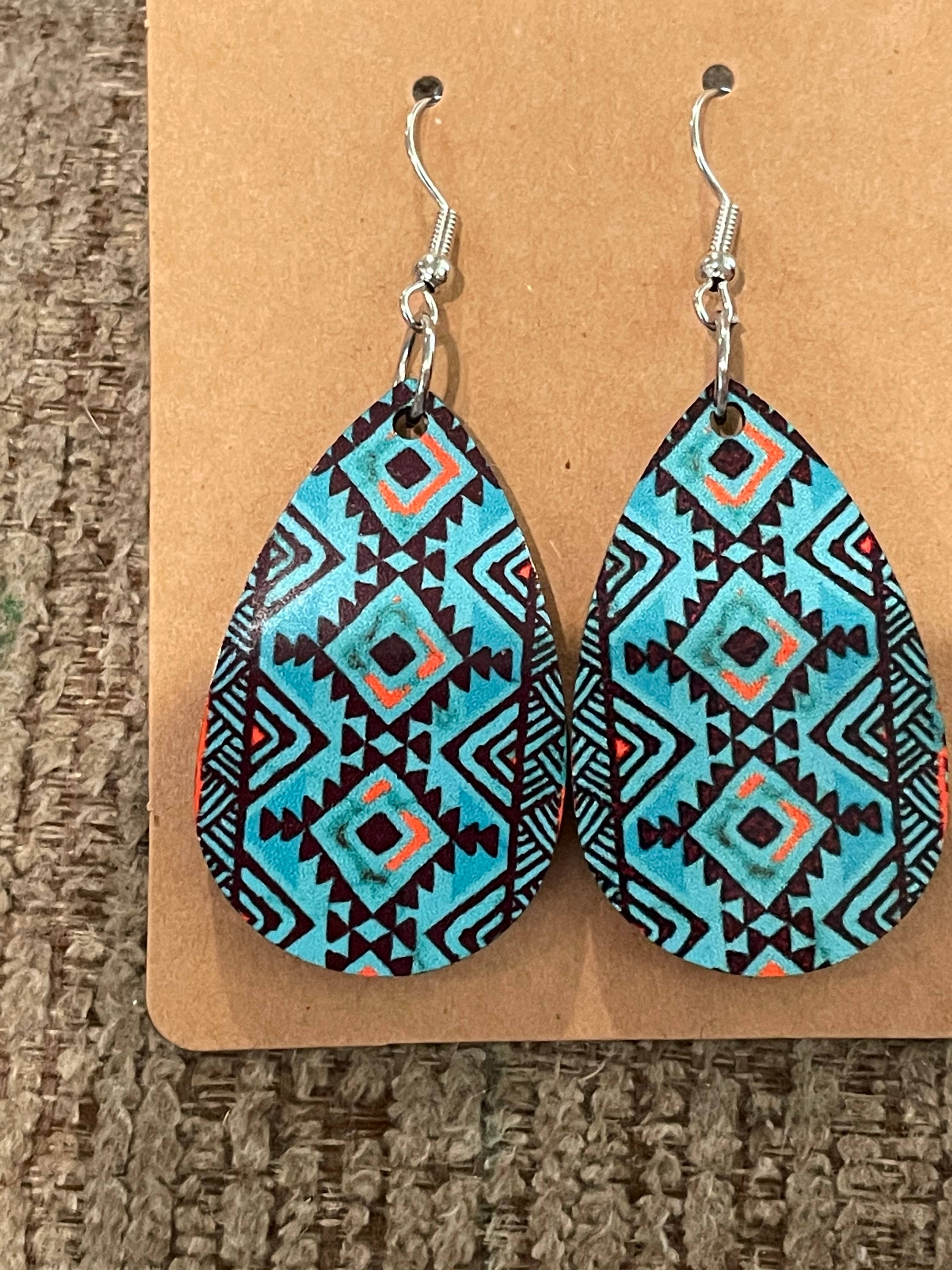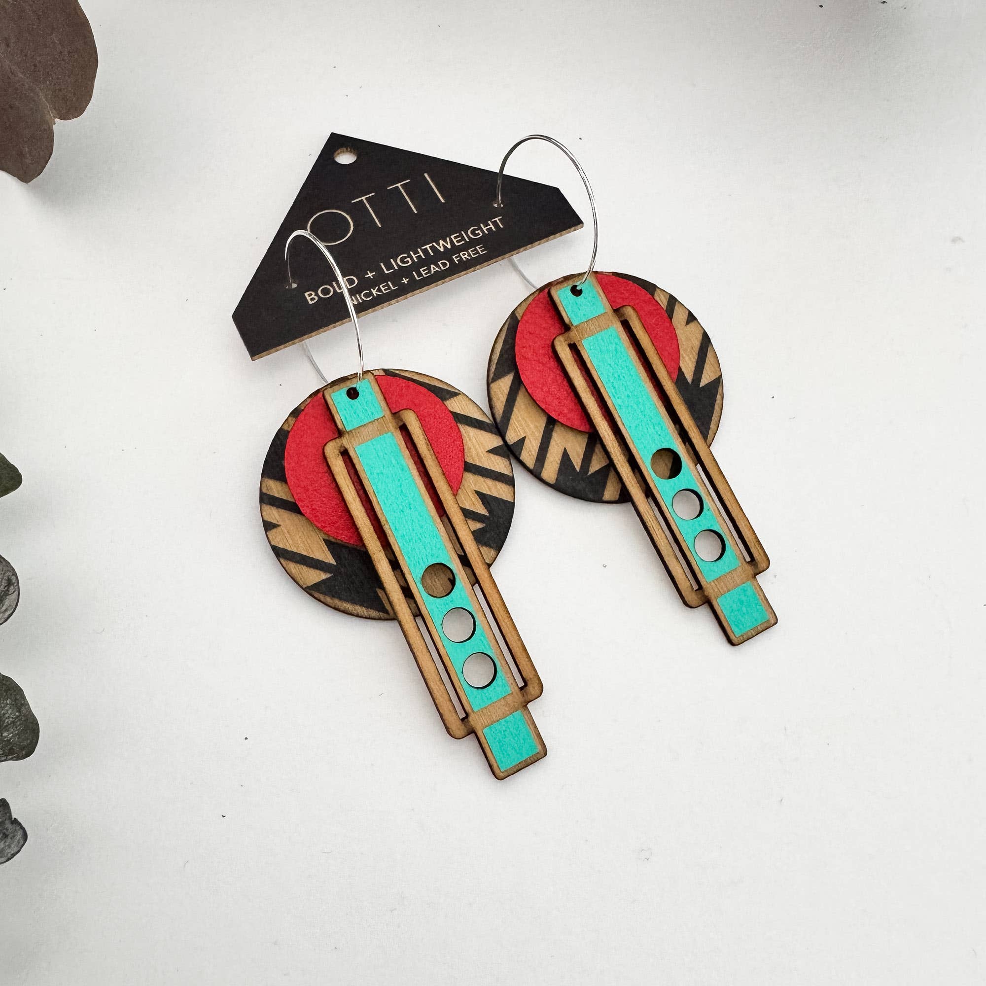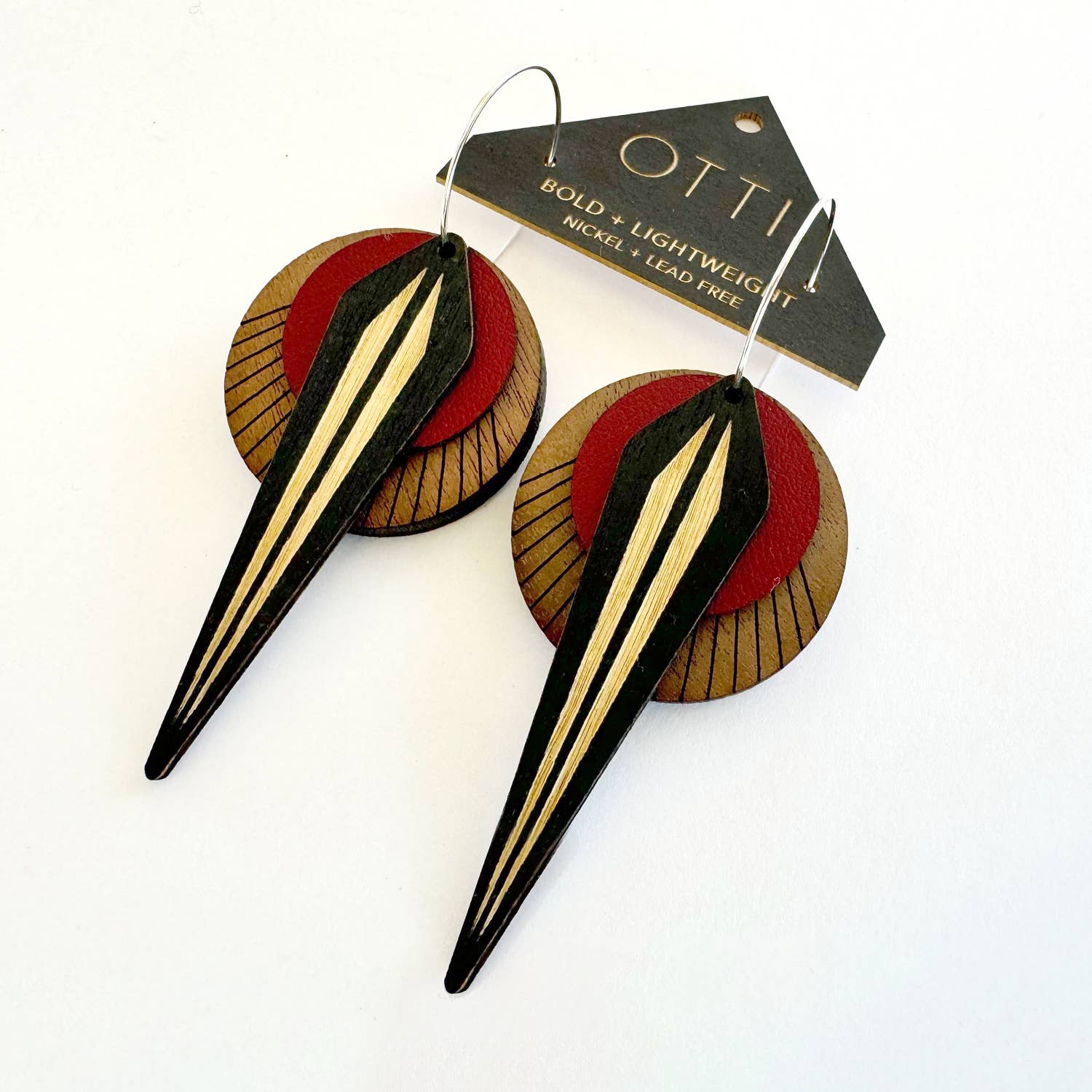 SKU: E-026 Made in United States Color: Black, Blue, and Red Is Set: Individual Material: Leather, Sterling Silver Plated, and Wood Occasion: Elevated Casual and Everyday Style: Bright & Bold and Statement Theme: Geometric Product Language: English Weight: 14.17 g (0.5 oz) Dimensions: 6.4 x 2.5 cm (2.5 x 1 in) Packaging: Recyclable and Reduced
