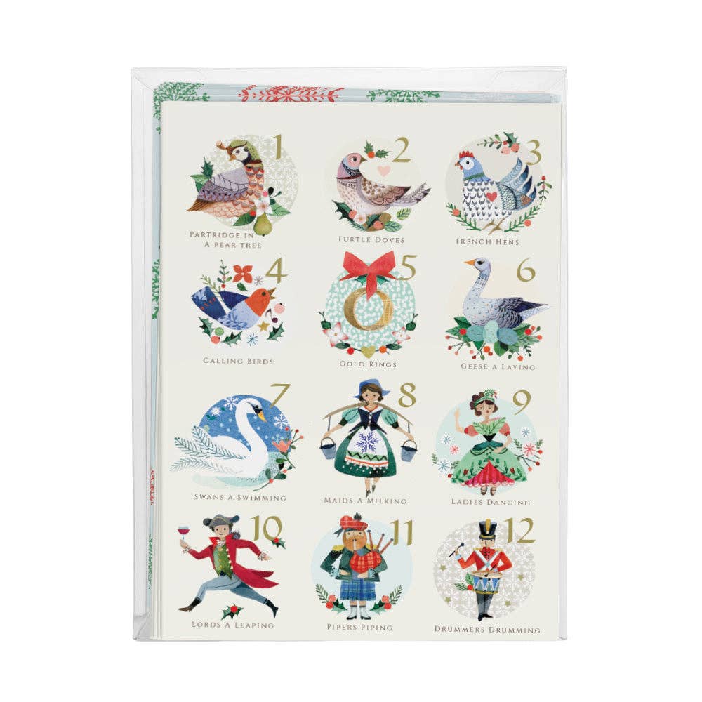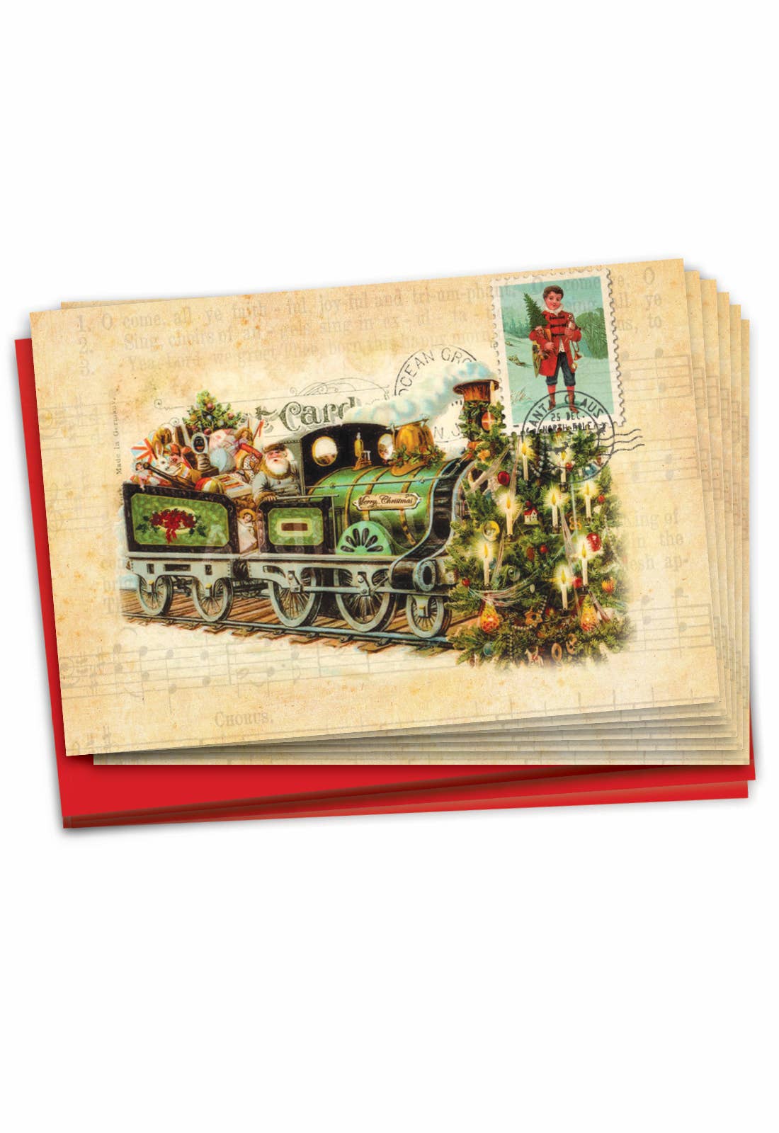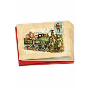 Send Christmas cheer with this festive card set featuring original art of Christmas-themed postage stamps. Part of our colorful holiday collection, this set of 8 blank cards is the perfect place to share your holiday greetings with family and friends. These eco-friendly cards are printed on high-quality, 100% recycled paper in Raleigh, NC, and include matching recycled kraft envelopes. + Set of 8 greeting cards with envelopes, 2 of each design + Blank folded card, size A2 4.25" L × 5.5" W + Printed on uncoated 100% recycled white cover paper + Comes with 100% recycled brown kraft envelopes + Boxed set of 8 + Sustainably printed in North Carolina + Packaged in recyclable & compostable materials + Original artwork copyrighted © by Chrissie Van Hoever
