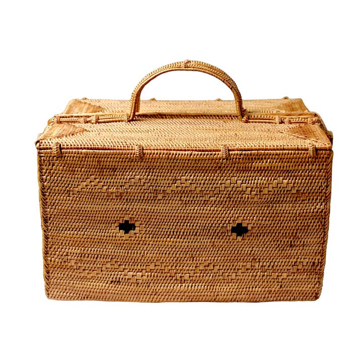 Our picnic basket collection highlights intricate handwoven traditional Indonesian basket weaving technique using eco-friendly and sustainable rattan/ata material. Our rattan collection is crafted by our certified artisan partners. Size: 4" H x 8" L x 6" D inches Material: Rattan Unlined interior