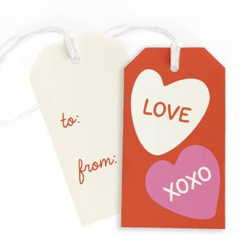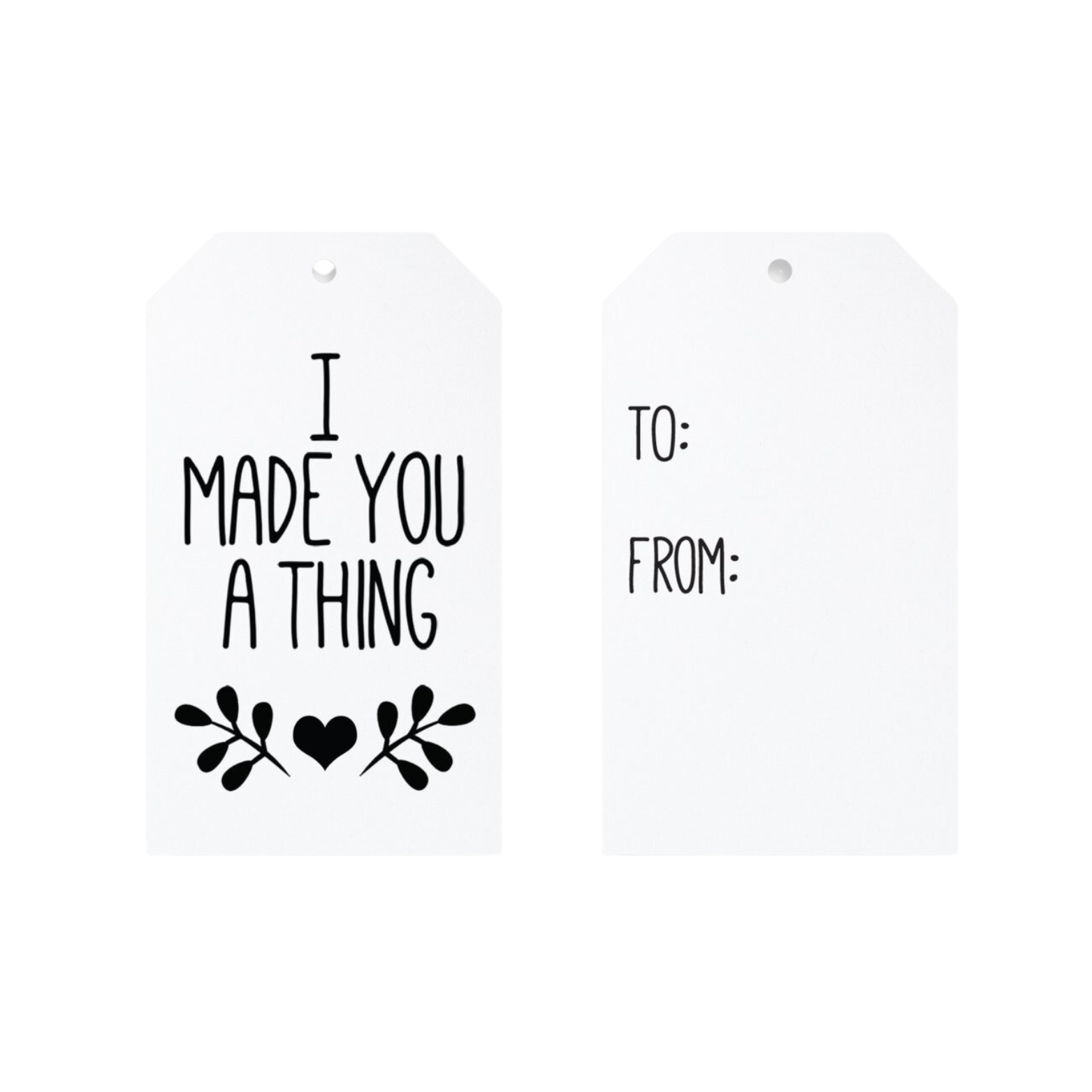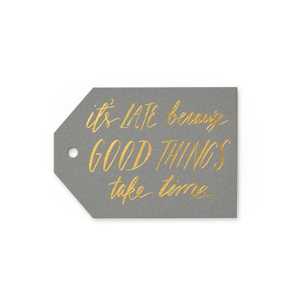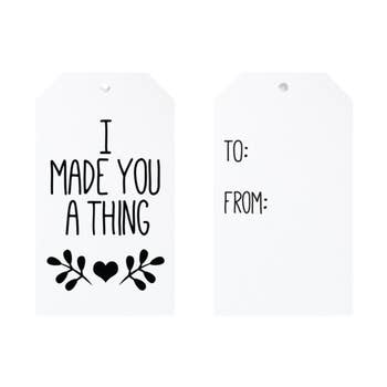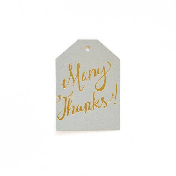 "This made me think of you ?" A happy hand-drawn greeting foil-stamped on a gift tag. • Tag size is 2.5" x 3.5" • Set of 6 assorted colors • Includes twine • Letterpress printed in Chico, California