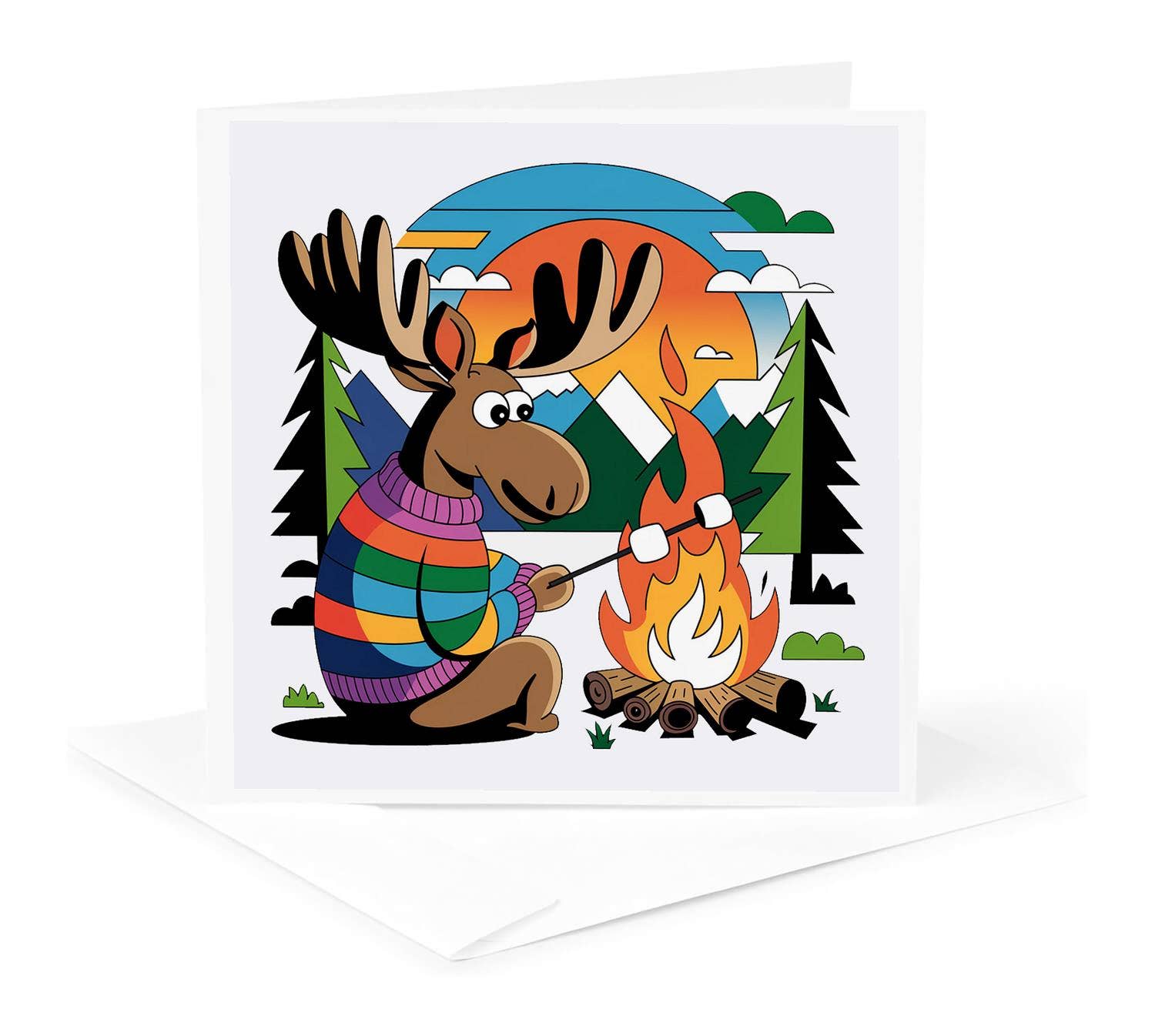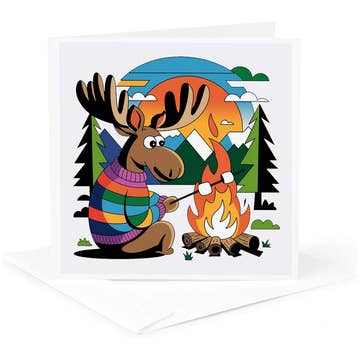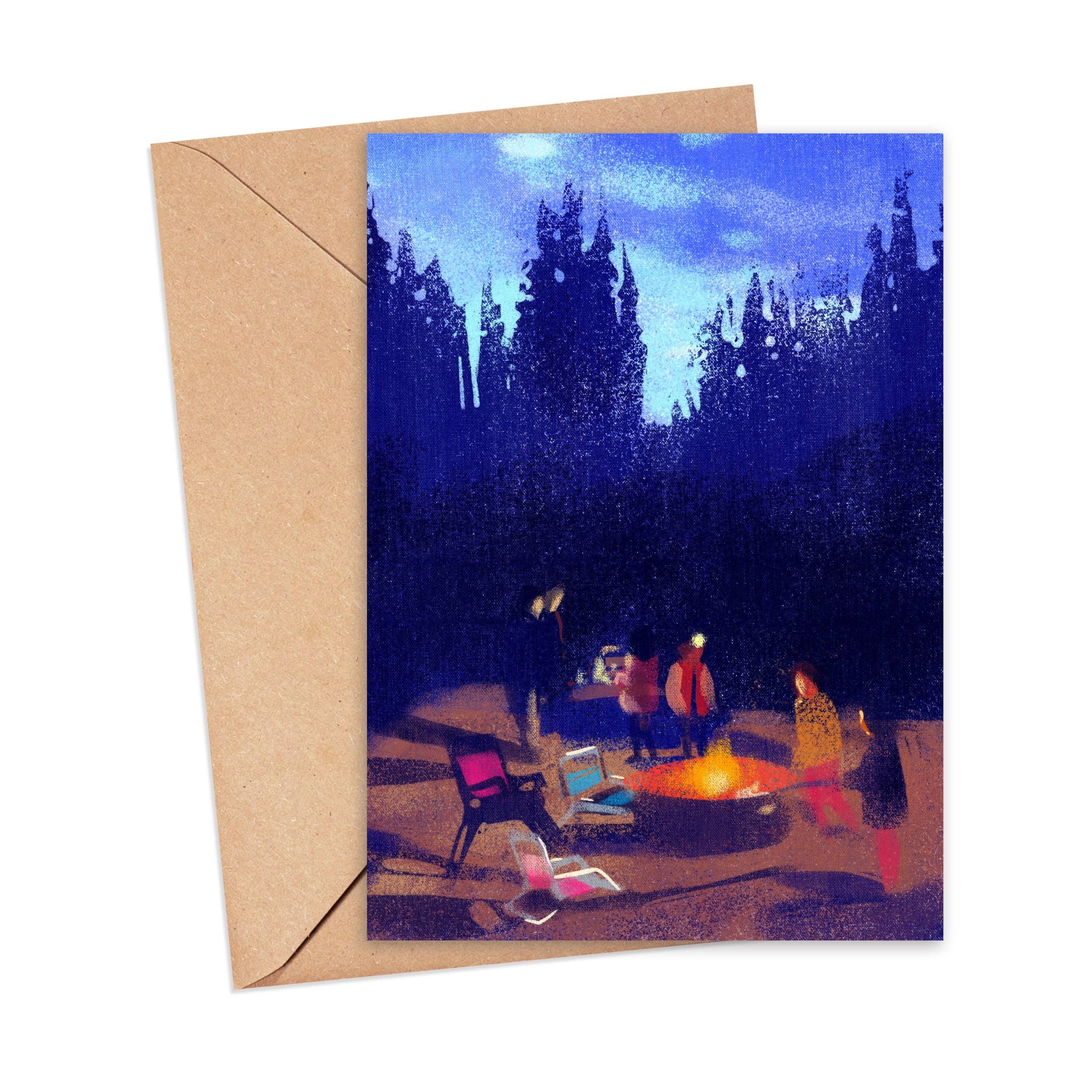 Wish you were here, dear friend, sitting around the campfire. My hand-drawn image is scanned, digitally colored and Professionally printed on super heavy ultrawhite 120# paper Size A2 5 1/2" tall x 4 1/4" wide. White envelope. This card is blank on the inside.