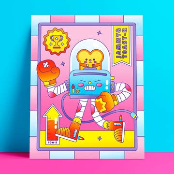 Put your fists up and get bready for the fight of your life, because you're about to go against the reigning Breakfast Brawlers. Jammy's got the bran and the brawn to give you a one-two punch that'll send you home to mama. T0AST-R is so jam-packed with Pow-R that not even his plug can keep him in line. Order up! Each art print is high quality, vibrant, and printed on ultra premium semi-gloss paper. This brighter than life print will light up any room that it's placed in; whether it be a bedroom, studio space, or kitchen! Additional information: • Choose between a 5x7 or 8x10 print • Includes one physical art print without frame • Comes with squared corners • Printed on high quality semi-gloss paper • Paper is 10 mil thick