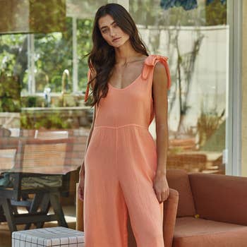 Linen Feel Woven Tie Strap Button Up Pocket Front Jumpsuit