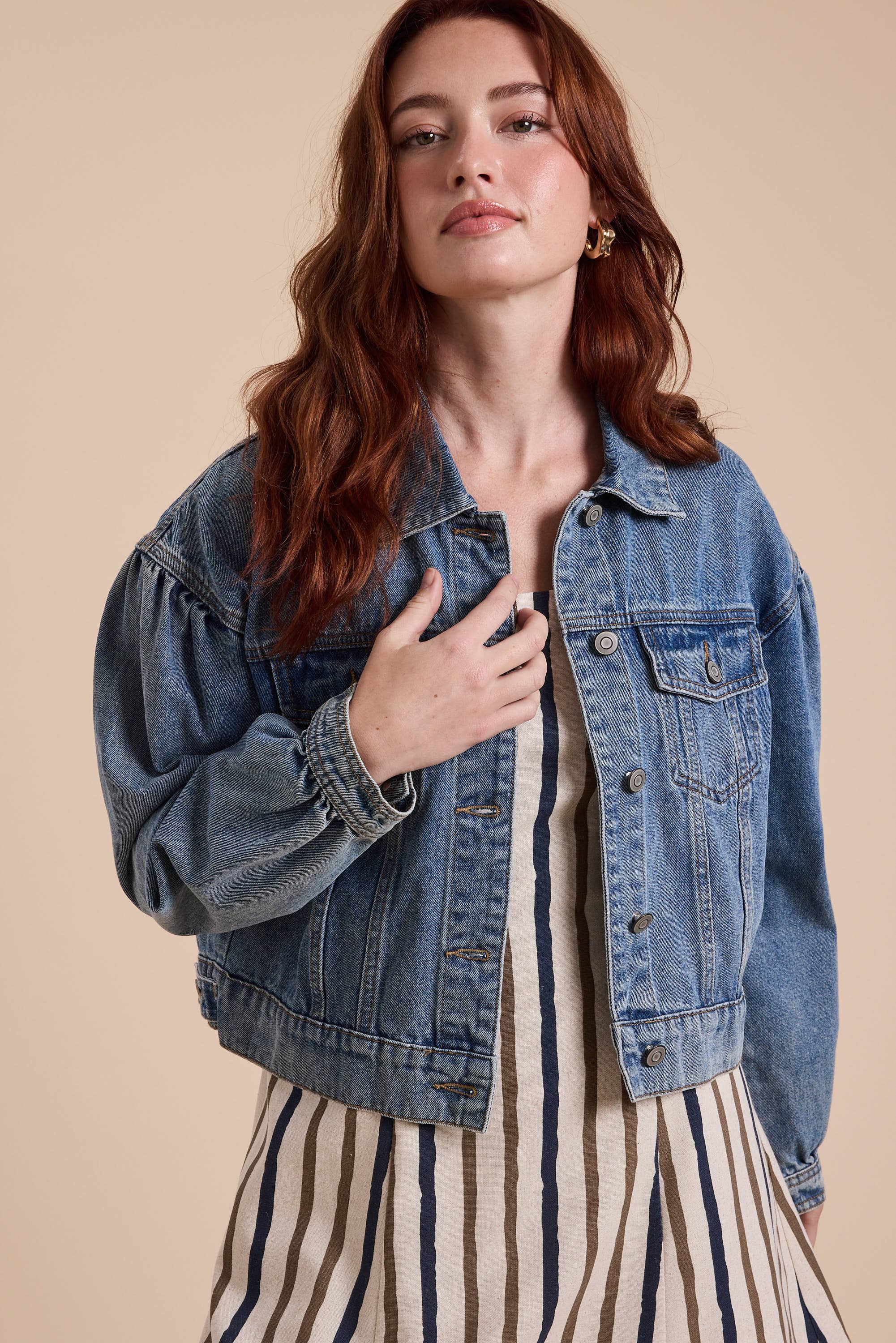 - Classic collared neckline for a timeless look - Soft, faded denim with vintage-inspired wash - Button-down front with metal hardware for a structured finish - Functional chest flap pockets for added practicality - Feminine ruffled hem with raw-edge detailing - Long sleeves with buttoned cuffs for adjustable styling - Comfortable and lightweight, perfect for layering - Model is 5' 7.5" 33-24-34 and wearing a size Small A chic take on a wardrobe staple, this denim jacket blends classic structure with playful ruffle details, making it a stylish layering piece for any casual or dressy look.
