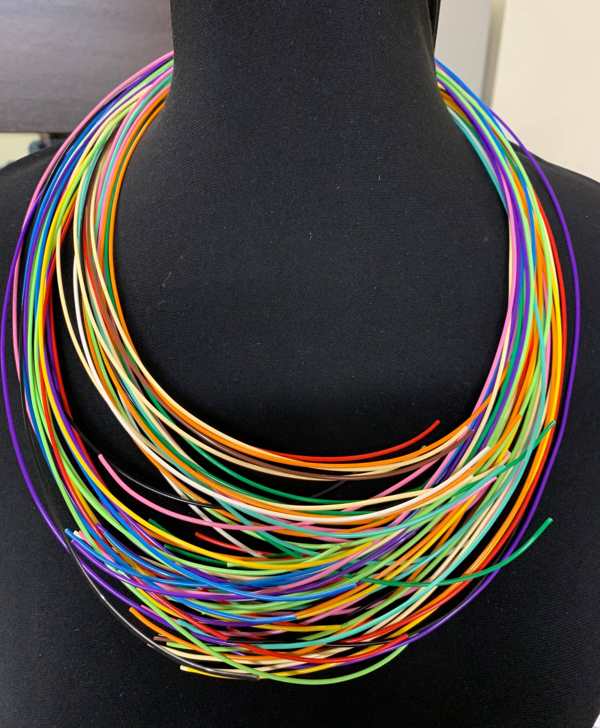 WAVE: This lightweight playful long red rubber necklace falls gracefully around the neck in waves like the sea. An unusual "finishing knot" can be worn in the back or in the front as a focal piece. Its name symbolizes the spirit of perseverance and courage. Made of silicone. Longest loop hits at about 44" Shortest loop hits at about 30" This fun layering piece is also available in orange or black