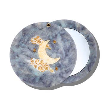 Assorted pocket mirrors featuring various fancy cats! There are three different designs including: Queen Cat - a tabby cat with a golden crown Frida Cat - a cat with a floral crown Caesar Cat - a white cat with a golden crown Each design features a related circular border. Each mirror measures 2.25 inches around and is printed in full color on recycled paper.