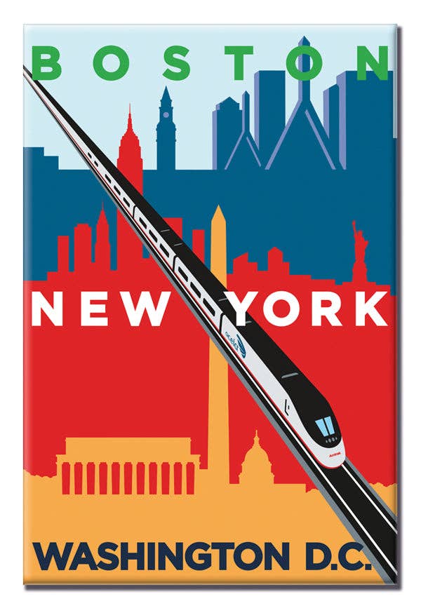 Get your All Aboard Amtrak Magnet from TransitGifts.com. This 2" x 3" magnet is made in the USA and is a charming tribute to our love for trains, subways, and buses, possibly originating from a visit to the Illinois Railway Museum. As an official licensee of Amtrak, we create mini platform signs, mugs, and more. This magnet is more than just a novelty, it's a keepsake that can stick right on your refrigerator.