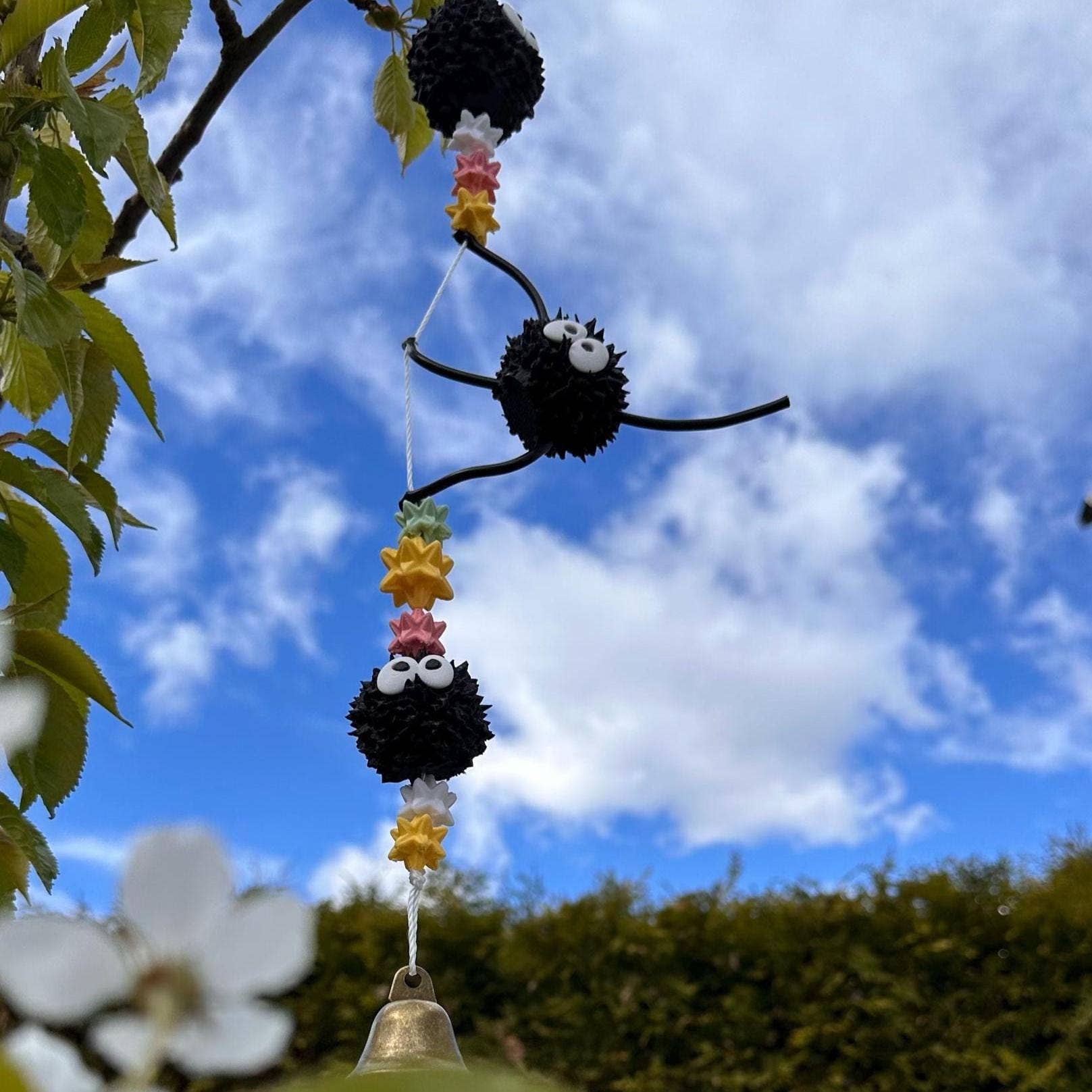 ✨ Bring a touch of gentle magic to your space with this whimsical wind chime ✨ Inspired by the curious charm of soot sprites and the soft clink of traditional Japanese garden bells. Perfect for hanging in a sunny window, garden tree, or quiet balcony corner—anywhere you’d like a dose of playful peace and studio-inspired serenity. If you would like more sound from your new cute friends, you can optionally remove the tassel, and the bell will ring in gentler breezes and a little louder. • Hand-assembled with love and care • Approx. total length: 60cm/24in • Made from lightweight, weather-resistant materials (for covered outdoor or indoor use) • Finished with a brass bell for a clear, gentle sound 🌱 Ideal as a gift for animation lovers, whimsical souls, or anyone who could use a bit of everyday wonder. 🧊 Quality: Each piece is crafted using 3D printing, resulting in unique items with subtle layer lines that add a bit of character.