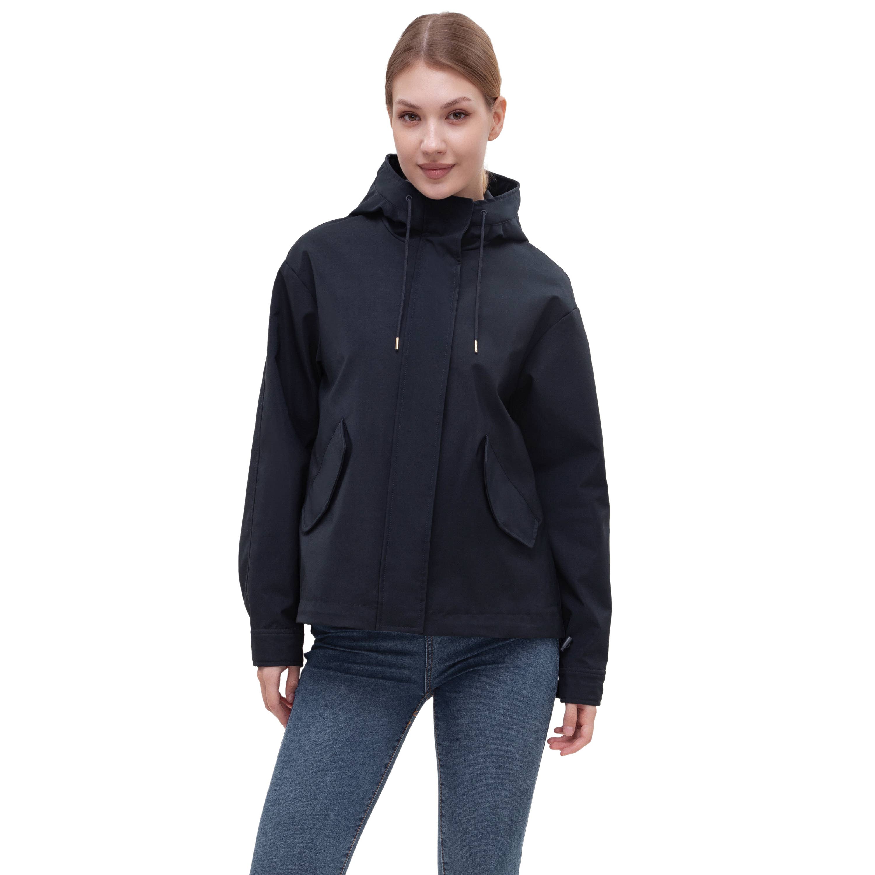 This Rokka&Rolla Women's Rain Jacket is a required essential for the rainy days. This women's rain jacket has a waterproof softshell fabric to keep you dry in any wet conditions. The rubberized fabric allows full stretch of mobility and comfort in this women's raincoat. The stylish rain parka jacket is lightweight and breathable to improve performance in wind-like weather. With snap pockets in the front, you can safely store your phone and wallet when you're on the run. Features • Waterproof, durable textile • Rubberized layer for harsh weather • Lightweight, breathable for mobility • Adjustable hood, windproof design • Model in Night Sky of WHITE BACKGROUND is 5'7'' and 121 lbs wearing Size M