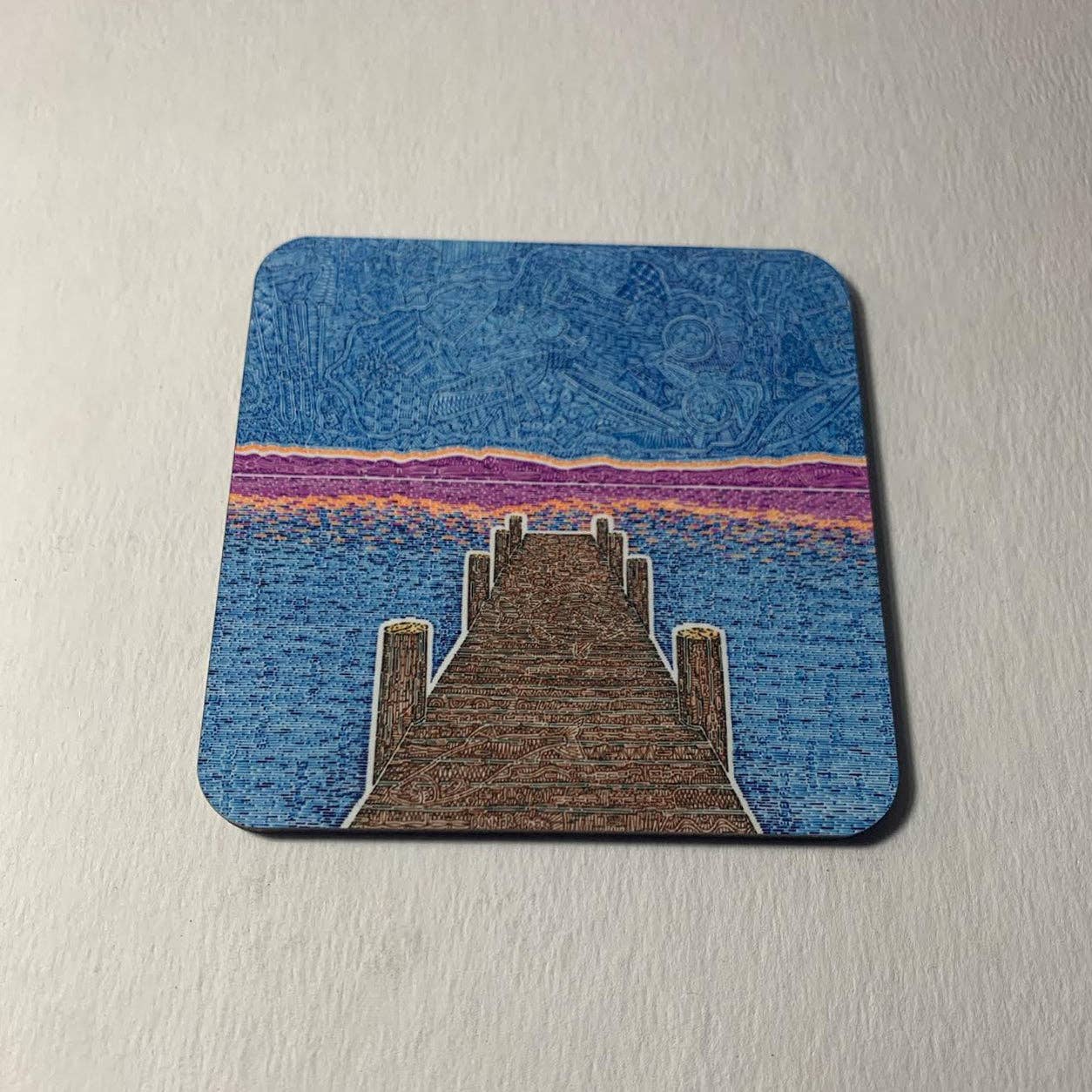 Coaster by Macone Clay with moon and border design. This ceramic coaster with crazed glass is super thirsty and just chomping at the bit to absorb condensation and drips. It is as functional as it is snappy in design, with high-quality rubber pads. Measures 4" x 4."