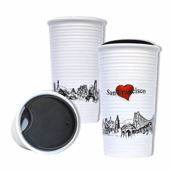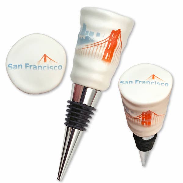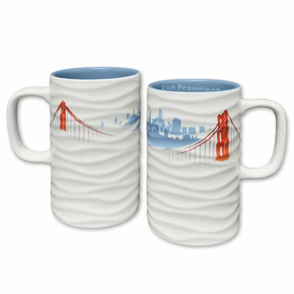 Designed by SF artist Kameron Peck. Frosted glass with gradient of cool blue/gray into white create the look of Karl the Fog nestled into the Golden Gate Bridge that we in San Francisco know all too well! Gift boxed. Hand wash, do not microwave