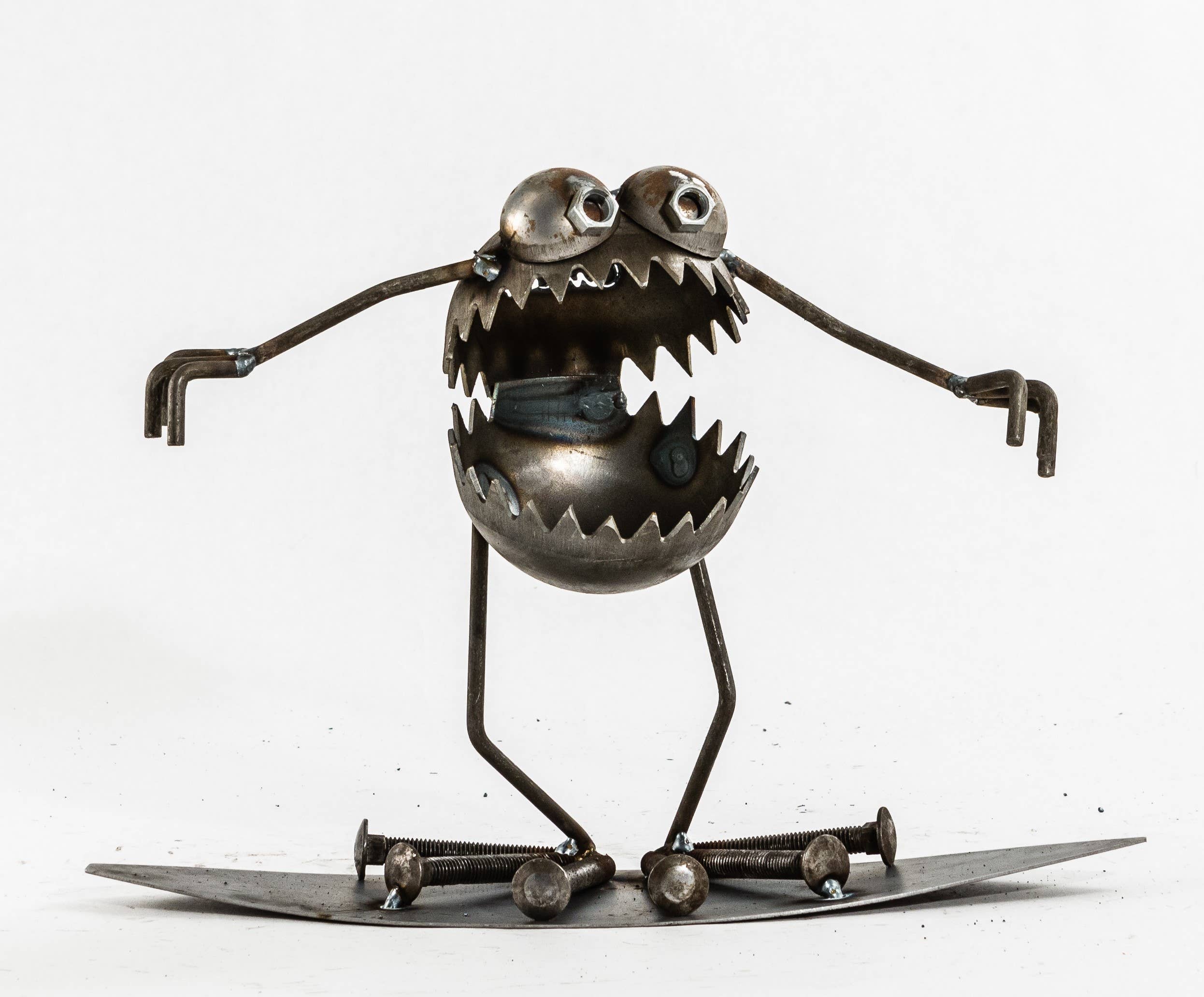 Medium GBG monster handmade from steel components. Approx. 12" tall. GBG riding skateboard feature.