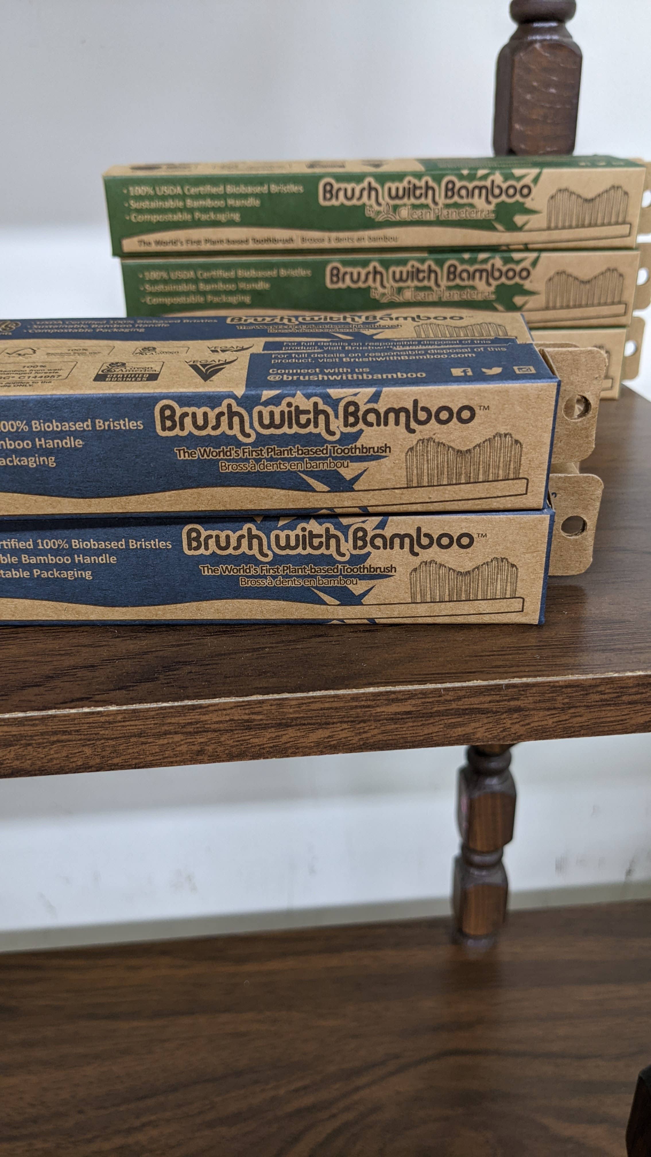 Every part of Brush with Bamboo’s Kids toothbrush is plant-based: bristles, handle, and box. -Standard Soft bristles made from 100% Castor Bean Oil. -USDA Certified 100% Biobased. -Bristles made in Germany. -FSC® Certified Bamboo handle. -The box encasing the toothbrush is made from paper – no tape or glue is used. -USDA Certified Biobased. -Green American Certified. -Vegan. -BPA-Free. -Natural and Non-toxic. Your bamboo toothbrushes can be used for just as long as plastic toothbrushes. Note: Many adults prefer to use a smaller toothbrush. This toothbrush can be used by adults too.