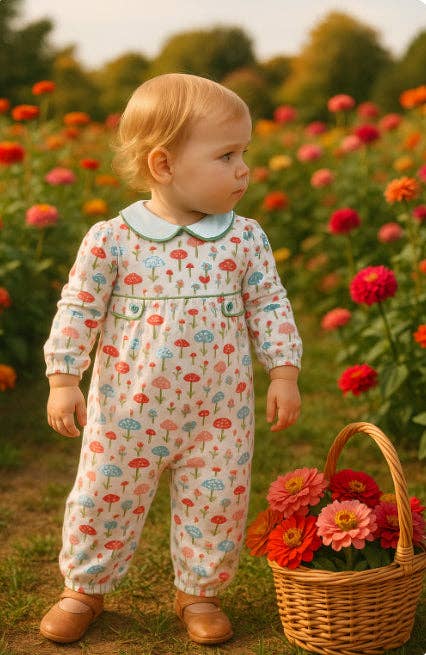 Soft, sweet, and perfectly cozy for the season! This long sleeve floral romper is made from 100% Peruvian Pima cotton, offering ultimate comfort for your little one’s fall adventures. The ruffled collar with delicate embroidered flowers and navy blue trim add a timeless, elegant touch that moms adore. With an all-over floral print inspired by autumn blooms and button closures in the back for easy dressing, this romper blends charm and practicality in one adorable piece. Perfect for family photos, pumpkin patch outings, or cozy days at home — it’s a must-have for the fall season. 100% Peruvian Pima cotton Hand embroidered Machine wash, tumble dry Imported from El Salvador