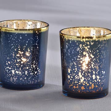 Nothing's more romantic than a softly flickering tea light in a mercury glass holder. Picture kate aspen’s blue mercury glass tea light holders scattered around your wedding, casting a soft glow on guests' faces. Look closely, and you'll notice that it looks like a starry night sky, with bright specks of light peeking through the navy mercury tea light holder. Features and facts: An antique-inspired navy blue mercury glass tea light holder features a decorative gold border. Measures 2"" w x 2.36"" h x 2"" in diameter. Sold in a set of 4. Tea lights not included.