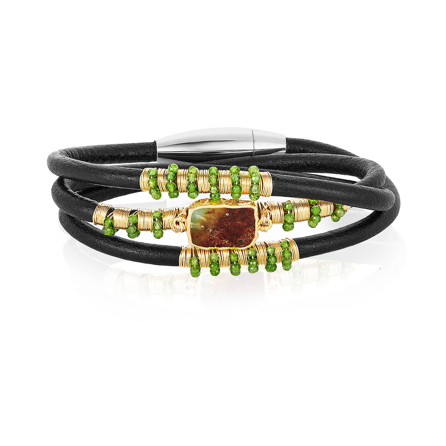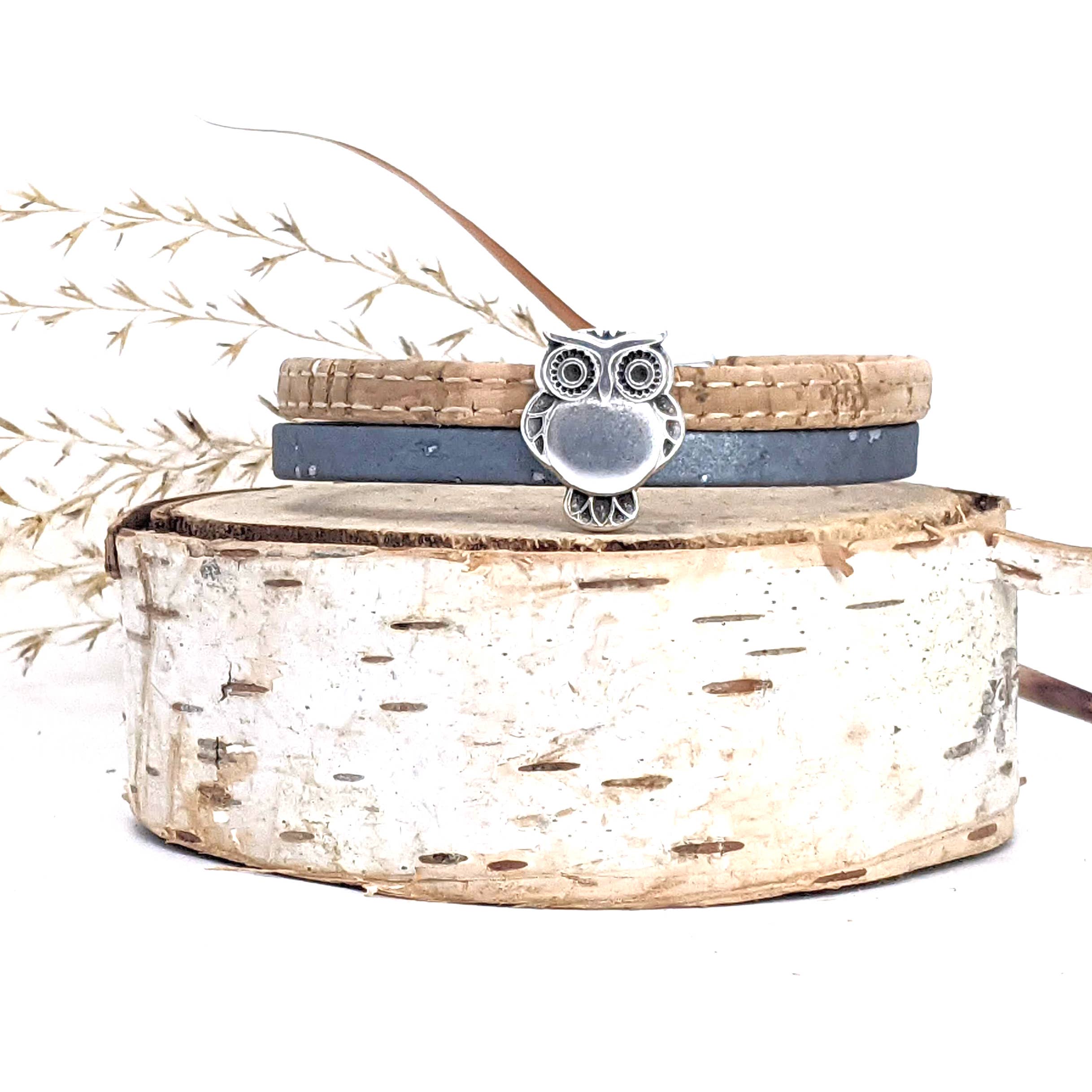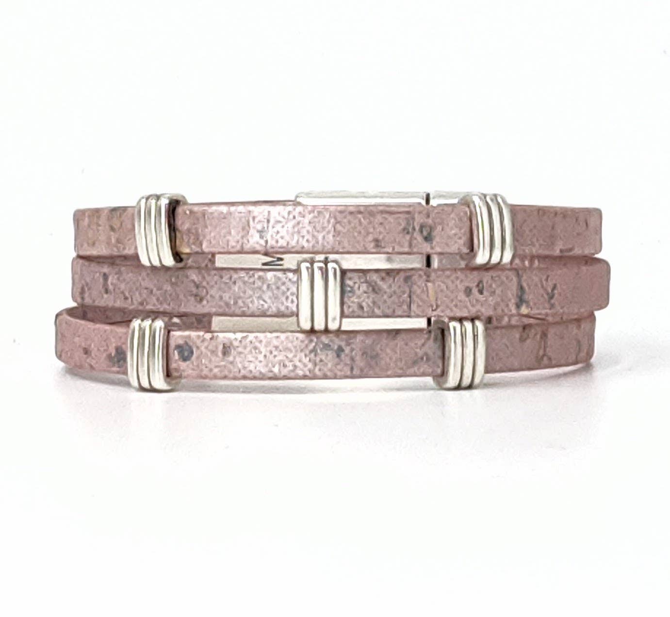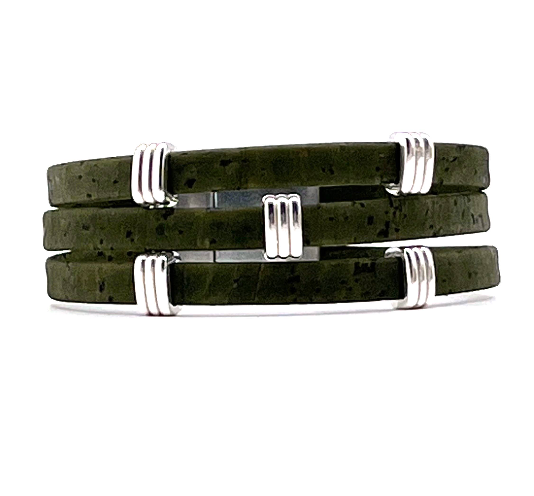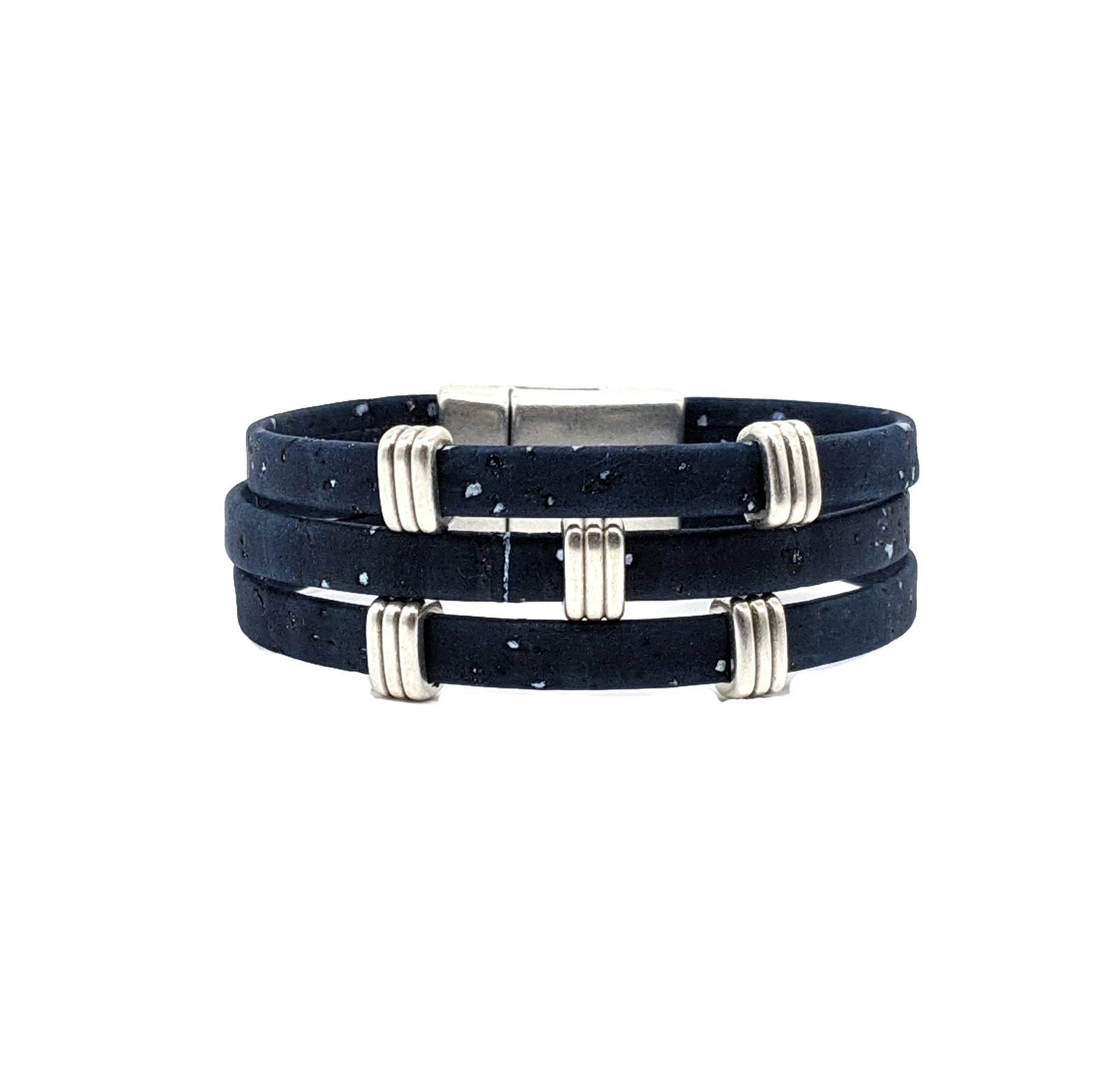 Three strands of Portuguese Cork Bracelet with antique silver accents and magnetic clasp (15mm wide) create a bold statement piece. Available in three sizes: Small: 6 1/2” finished length Medium: 7” finished length ** Large: 7 1/2” finished length ** Most popular size Cork is used as a vegan substitute for leather in a wide range of products including jewelry. Cork is a natural material, therefore each item will be unique.