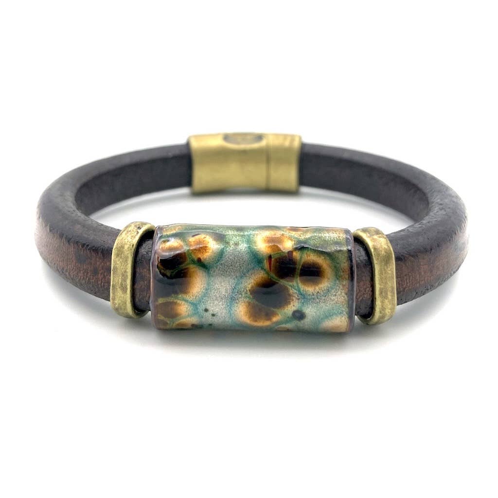Beautiful blue, green and gold hand enameled bead pairs perfectly with Big Sky blue leather and high quality copper plated accents. Strong, magnetic clasp keeps the bracelet secure on the wrist. Unisex appeal. This is a popular design in our Coppermine Collection. Available in sizes S (7"), M (7.5"), L (8", and XL (8.5"). The most common size for women is M, most common for men is L to XL. Proudly made in Montana, USA.