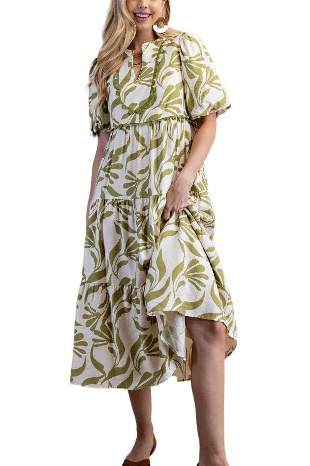 SKU: I2525005-GEOST-GREEN-M Made in India Aesthetic: Bohemian and Casual Care Instructions: Hand wash Dress Style: A-line and Sundress Embellishment: Pleat Fabric: 100% Cotton Fit: Contemporary and Missy Occasion: Day Party and Resort / Vacation Pattern: Floral Season: Spring/Summer Skirt & Dress Length: Midi Sleeve Length: 3/4 Sleeve Weight: 317.51 g (11.2 oz) Production: Ethically sourced