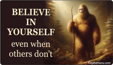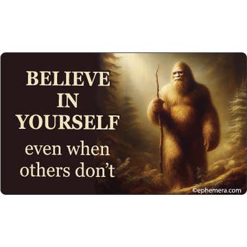 Believe Yeti sticker, 2 size: 3" laptop decal size & 4" bumper sticker size. Durable die-cut vinyl decal with a matte UV-resistant coating. Waterproof & weatherproof for indoor & outdoor adventures. Perfect impulse buy item for a gift shop, boutique, camping store, outdoor outfitter, national park store, or ski shop. Get a daily boost of confidence from our snowy cryptid friend with our Believe in Yourself (even if no one else does) Yeti sticker. This mysterious mythological creature exudes confidence and even a bit of sass. Perfect gift for friends who love snowshoeing and Sasquatch hunting, or just those in need of a cute Hydroflask sticker. This cute mountain Yeti is featured in our Believe in Yourself (Even if No One Else Does) Yeti sticker, available in our shop. Place this Yeti bumper sticker on your car, truck, or RV camper. Great waterproof decal for Hydroflask water bottles, drink tumblers, insulated mugs, & thermoses.