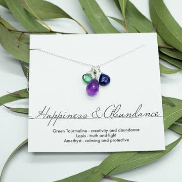 3 Meaningful Stones to bring together Happiness & Abundance Green Tourmaline-creativity and abundance Lapis- truth and light Amethyst-calming and protection Our cluster necklace is available in 18" in length.
