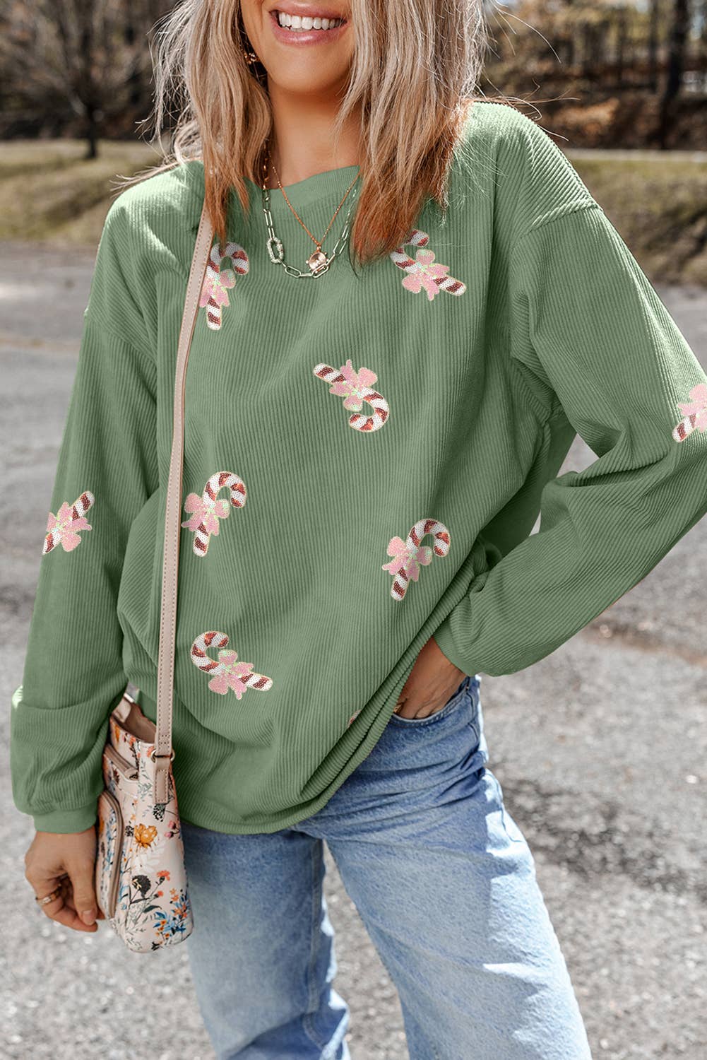- Ribbed crew neck women's sweatshirts - Casual drop shoulder - Long-sleeve ribbed hem - Rhinestone embellishment detail - Comfortable, relaxed fit - Lightweight and breathable - Holiday, Christmas, daily life, dating, going out, vacation, shopping... * Model is 5'8, 32-27-37, wearing SMALL