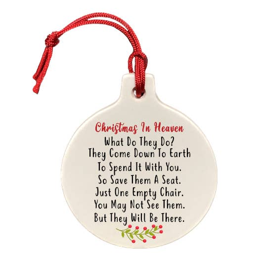 Modern and unique designs, HANDMADE in Canada, these gloss ceramic ornaments make the perfect gift for anyone in your life. Features Good quality, porcelain round, approximately 3.5" diameter, 3/8 thickness. This is a gloss white ceramic ornament. Included is a small red cord for hanging. The back of the ornament is white and can be personalized by you with a paint pen or a permanent marker. Personalize with a date, the year or a message to a friend. Made in Canada with imported materials.