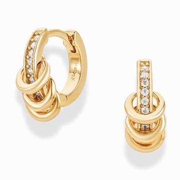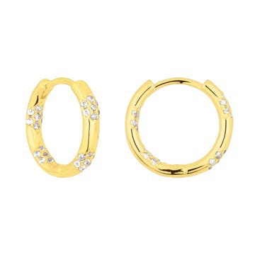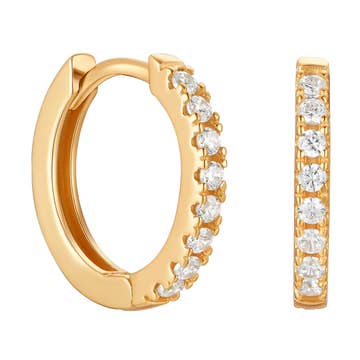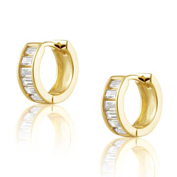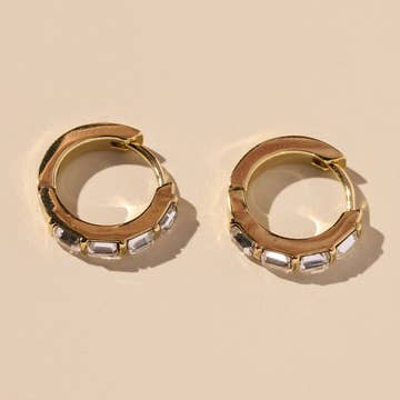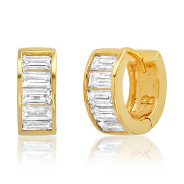 Our Queen Huggies are made to effortlessly stand out. Featuring baguette accents, these lightweight hoops speak for themselves. 9.5mm in diameter 18kt PVD Gold Plated over Stainless Steel Waterproof & Tarnish Resistant
