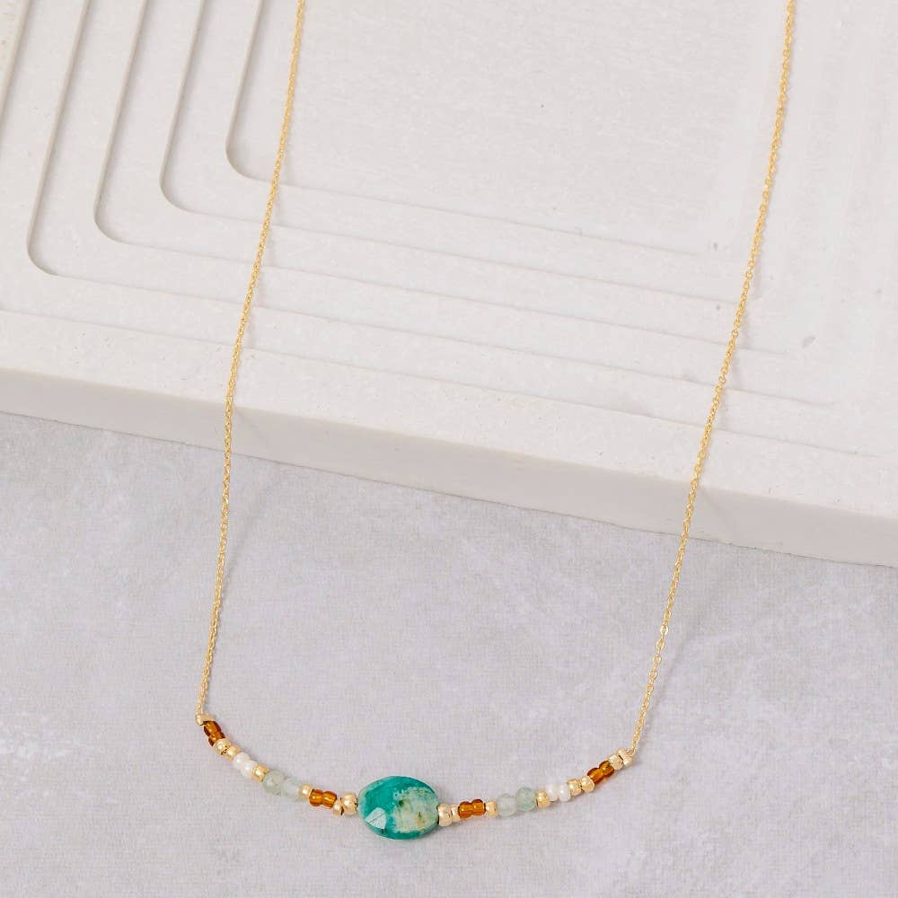 Seven colorful Kantha beads form a horizontal line, and are bookended by sparkly gold glimmer beads to create a delicate silhouette. Give a ethical & sustainable gift this holiday season! This necklace makes the perfect gift for Christmas 2025 or stocking stuffers. • Measures 18" with a 3" extender. • Sustainably handmade from repurposed cotton Sari & Kantha textiles by women artisans in India. • Colors & patterns will vary due to repurposed textiles.