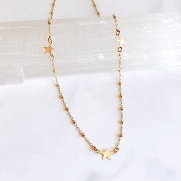 This simple little necklace is so flattering and versatile. It’s beautiful on its own and also looks great as a layering necklace. It features three small 14kt gold filled star charms spaced out on the chain. The stars are hammered with a dappled texture to catch the light. The stunning chain is a 14kt gold filled bead chain. It is finished with a spring ring clasp. It has an extender to make the length adjustable to 16-18”.