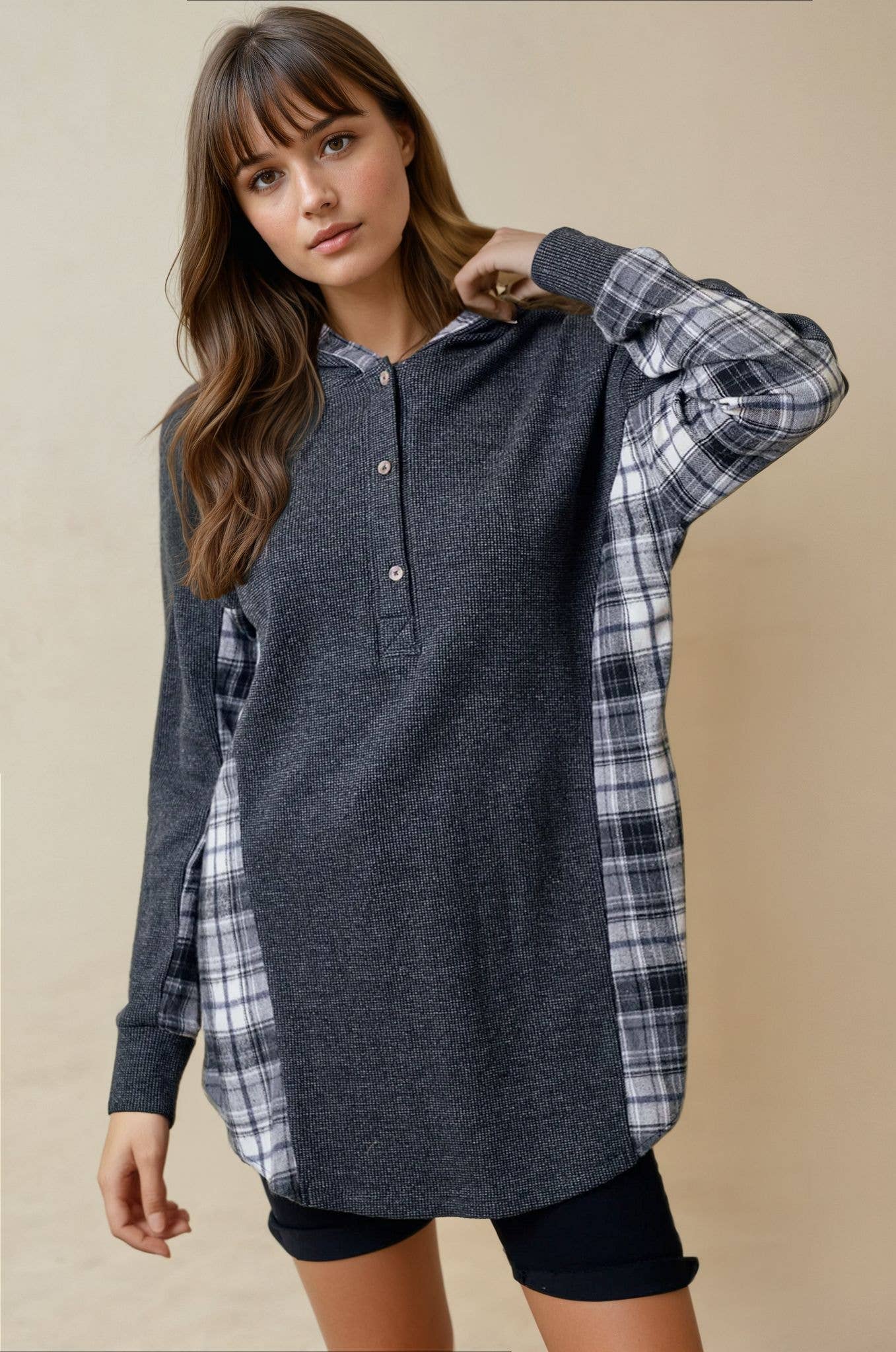 Embrace the casual aesthetic with the X211308T-Plaid Plus Size Top from Chris & Carol Apparel. This top, featuring a button-trimmed neck, is perfect for the Fall/Winter season. Made with a comfortable blend of 84% Poly, 11% Rayon, and 5% Spandex, it offers a contemporary fit that's perfect for any holiday occasion. Care for this garment is simple, as it's machine washable.