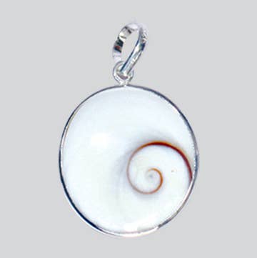 Our petite Eye of Shiva pendant features a stunning round cut operculum shell set in .925 sterling silver. Each pendant measures 7/8ths of an inch long including the bail (23mm) and 5/8ths of an inch wide (14.75mm). The bail has a 5.5mm by 4.5mm opening to fit over your favorite chain. Also known as Pacific Cat's Eyes, these shells are made by nature and loved by many peoples and cultures around the world. The Eye of Shiva is the operculum of gastropods, or the 'lid' they use to close themselves into their shells. Each Shiva pendant is a PENDANT ONLY ~ We have discounted adjustable chains in our shop that can be paired with each pendant. These are made using natural materials, so variations in size, spirals, and color should be expected between pieces.