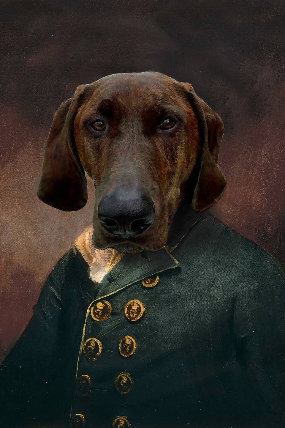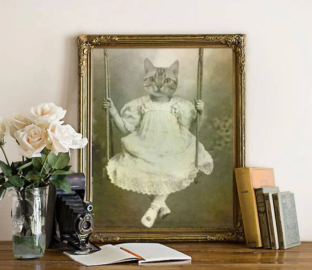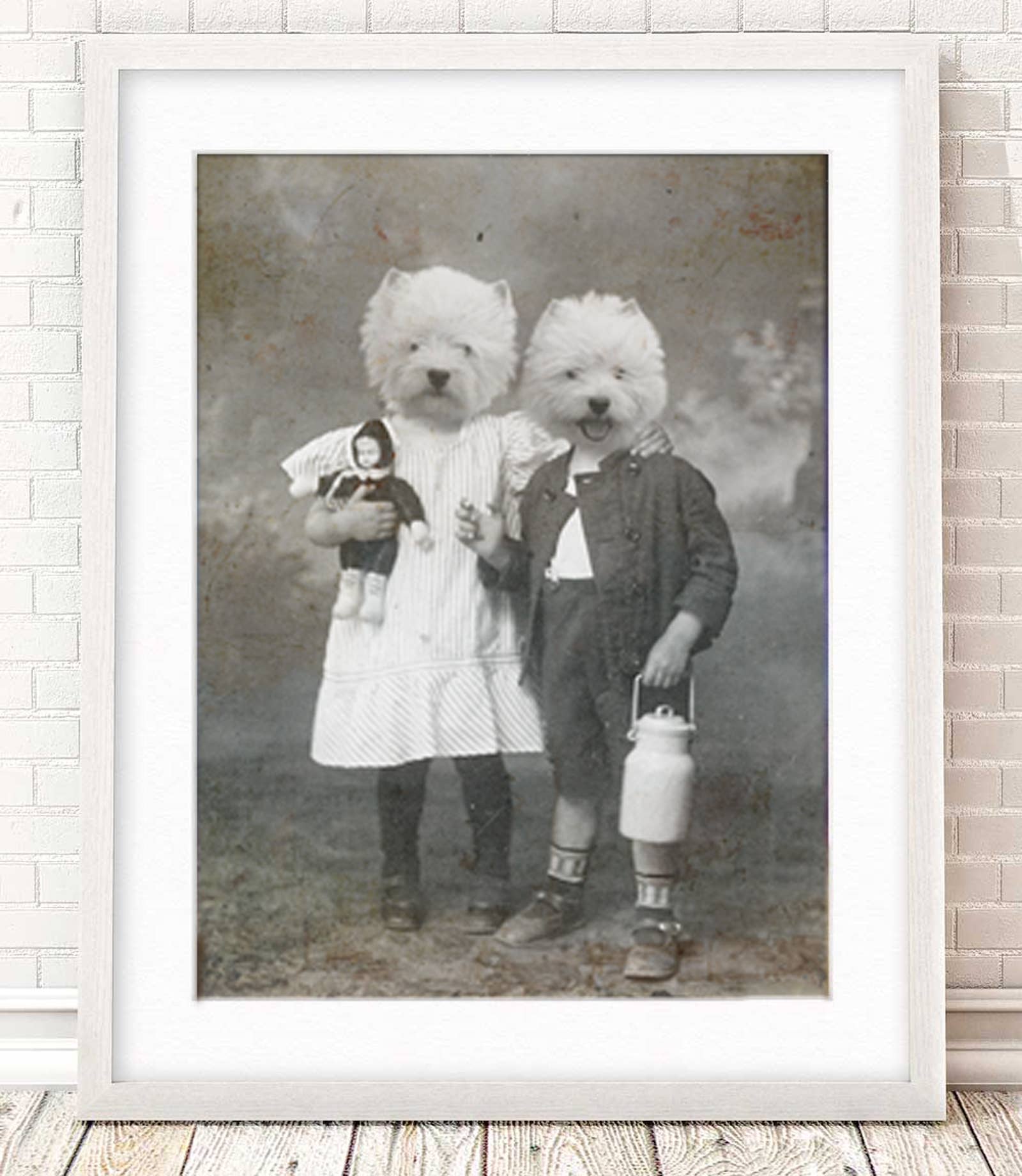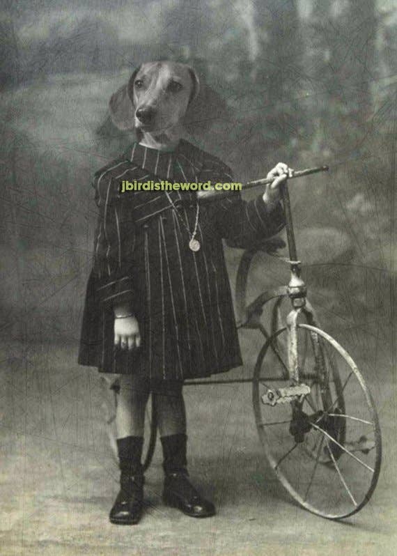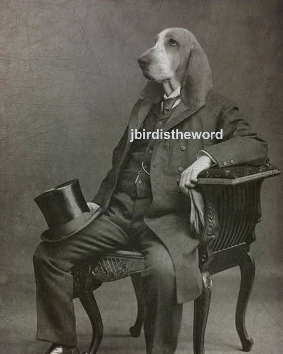 Unique art to please the unique characters in us all! These Matte prints are archival and superb in quality and acid free. Artwork has the same quality as a real photograph. Here are some great ideas to display/give your custom artwork: ** Hang it in your foyer as guests come into your home. ** Sneak it among your family portraits and watch your friends reaction. ** Give as a gift and watch the recipient giggle uncontrollably! I guarantee they will last over 200 years when taken care of. Prints come in a clear bag with board backing to ensure longevity. I combine real antique photographs with photographs of pets and wild animals to create cute and sometimes creepy artwork guaranteed to spark a conversation and reaction! I use Photoshop to digitally paint the images together and add textures that I have photographed for an extra vintage feel. Dressed up Dog in Clothes