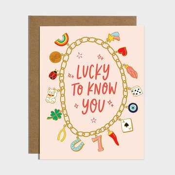Letterpress printed folded card, blank inside Size A2 (4-1/4" x 5-1/2") Image Description: a white folded A2 letterpress card, the green text "I'm so lucky to have you!" in the bright top corner, two clovers cross at the stems below the text, little red hearts are around the text and flowers All images, products and designs © Noteworthy Paper & Press