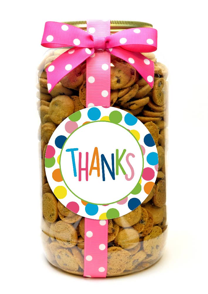 These bite-sized cookies are made fresh daily by skilled artisans using the best ingredients. Choose from 4 cookie flavors. Wrapped in our charming, giftable labels and ribbons these jars are perfect for any occasion and make a great gift. - Our best-selling Chocolate Chip Cookies are filled with real butter, hand-cracked eggs, and gourmet chocolate chips. - The Confetti Cupcake Cookies are made with our homemade vanilla batter and tiny bits of colorful frosting mixed in. - Whipped Butter Cookies were born when we took the chocolate chips out of our Chocolate Chip cookies. - Brownie Crisps are made with a rich cocoa batter and gourmet white chocolate chips. * Case of 12 plastic quart jars * Each jar has 10 oz of cookies * 4 pieces each - Happy Dot Sweet Treats, Thank You & Happy Birthday labels * Assorted ribbon colors * Jar measures about 4" w x 7" h * 6 month shelf life * Complimentary sampling bag with each case of cookies