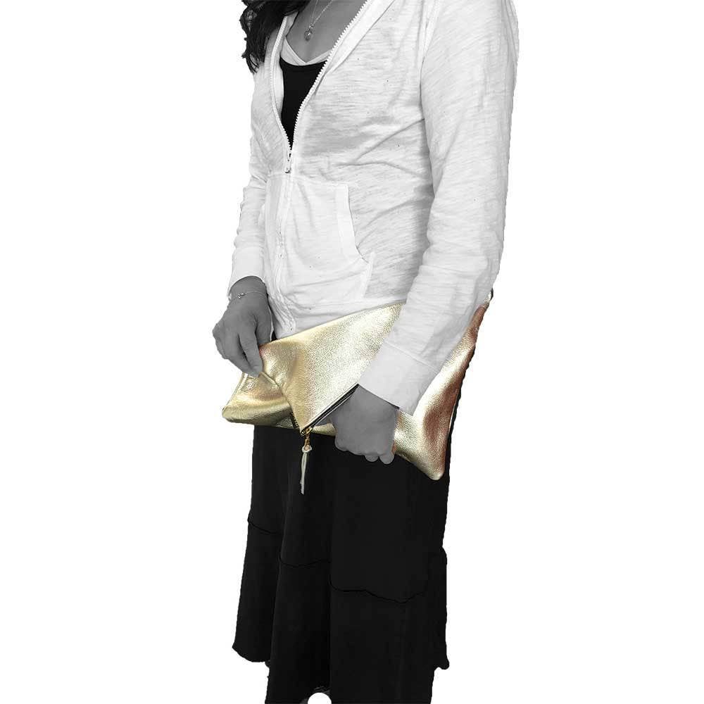Our best selling foldover - The Adeline - updated with stripes. On-trend, your customers want this for their everyday and their special day. Soft, metallic, camo - the choices are endless. Get in touch if you'd like a custom selection. Note: There is a $5 upcharge for Fang leather - in addition to the premium leather, all snakeskin is lined. DETAILS: Approx 9"x11.5". Brass YKK zipper. Unlined. Small matching zipper pull.