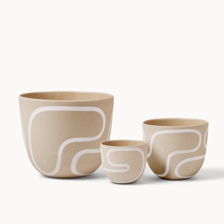 Elevate your gardening game with Franca planters. Designed to add character and movement to your environment, complementing your greenery with playful patterns. Material: White earthenware w/ clear gloss glaze finish Sizes: Small: 4.5" dia x 3.75" H Medium: 6.25" dia x 5.25" H Large: 9" dia x 7.5" H All sizes have drainage holes Care: Hand wash only Note: Each piece is handcrafted and hand-painted. We expect and embrace subtle variations. Handmade in Brooklyn, New York