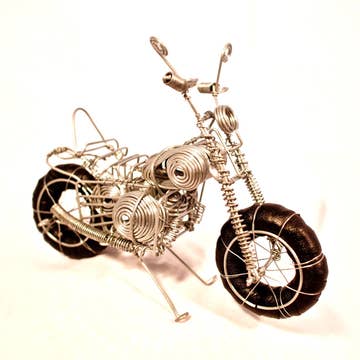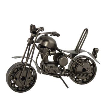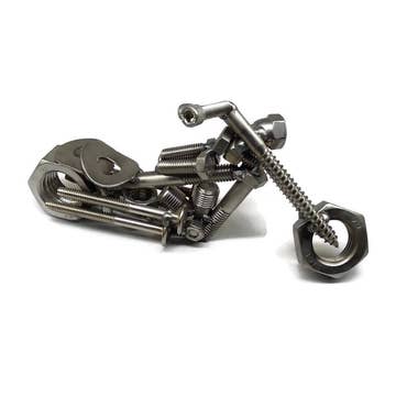 This is a handmade scrap metal motorcycle. The chopper is crafted from nuts, bolts, washers, and wire all welded together. This is the perfect paperweight for your desk or the perfect gift for the motorcycle rider or fan. This is pretty heavy and it is metal. The sharp edges have all been cleaned up and the welded motorcycle is sprayed with a clear polyurethane finish to help protect against rust.